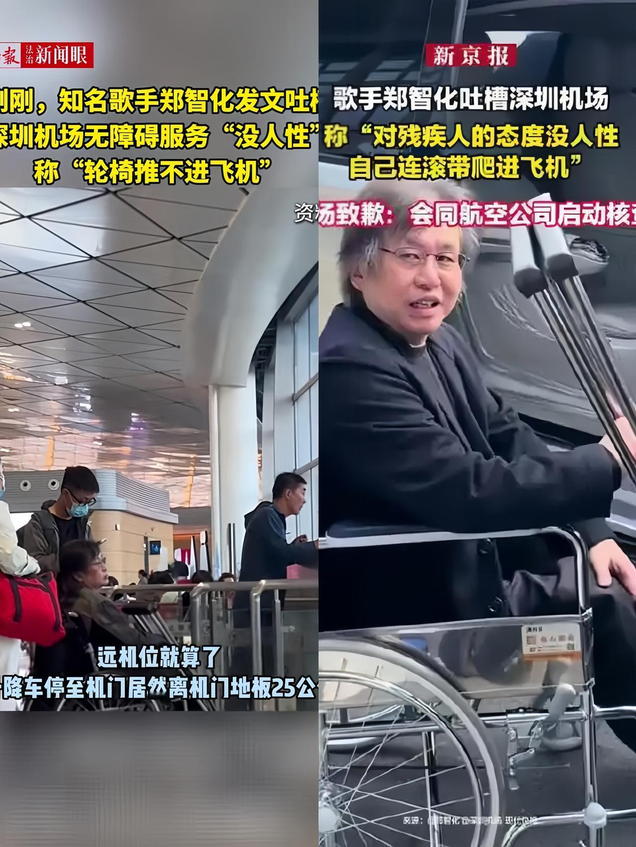 郑智化这次的争议,不是因为他指责深圳机场,而是因为他没有遵守残疾人必须提前联系的规定。他作为一个常坐飞机的艺人,应该知道残疾人坐飞机的规定,他没有提前预约,到了机场才想起来要残疾人专用的服务,当然不可能有这种服务了。如果他提前预约,这种不愉快的事情就不会发生。郑智化