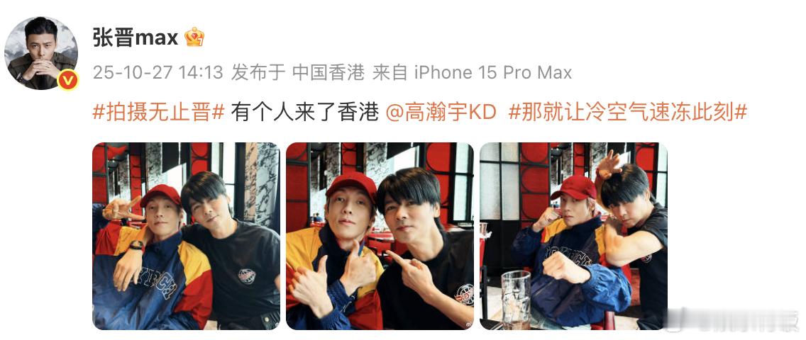张晋高瀚宇在香港重聚 谁青回?!张晋 max 晒出和高瀚宇 KD 的香港同框照,两人贴脸比耶、搞怪互动,我们父子组终于又见面了!