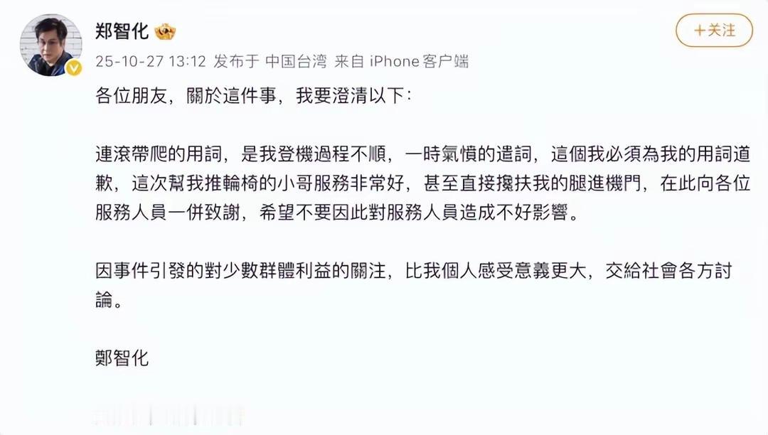 郑智化道歉了!明星也是正常人,也有七情六欲。 今天刷到一段视频,曾经的知名歌手郑智化,前两天因为在深圳机场登机事件引起了沸沸扬扬的舆论关注。今天,他公开道歉了,解释说“连滚带爬”是登机不顺时说的气话,现在郑重向机场服务人员致歉,还特别点赞了帮忙推轮椅的小哥。 这事儿反转得挺有意思,明星也是人,着急上火时说话难免夸张。可贵的是他事后不嘴硬,该认错认错,该表扬表扬,态度挺拉好感。 更赞的是他点出关键,这件事引发的对特殊群体出行便利的讨论,比个人感受更重要!机场无障碍设施、服务水平确实值得全社会持续关注。 希望这次小风波能变成大进步,让每个人出行都能更从容