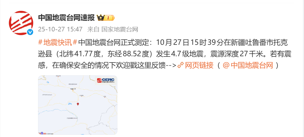 【愿平安!#新疆吐鲁番4.7级地震#】中国地震台网正式测定:10月27日15时39分在新疆吐鲁番市托克逊县(北纬41.77度,东经88.52度)发生4.7级地震,震源深度27千米。