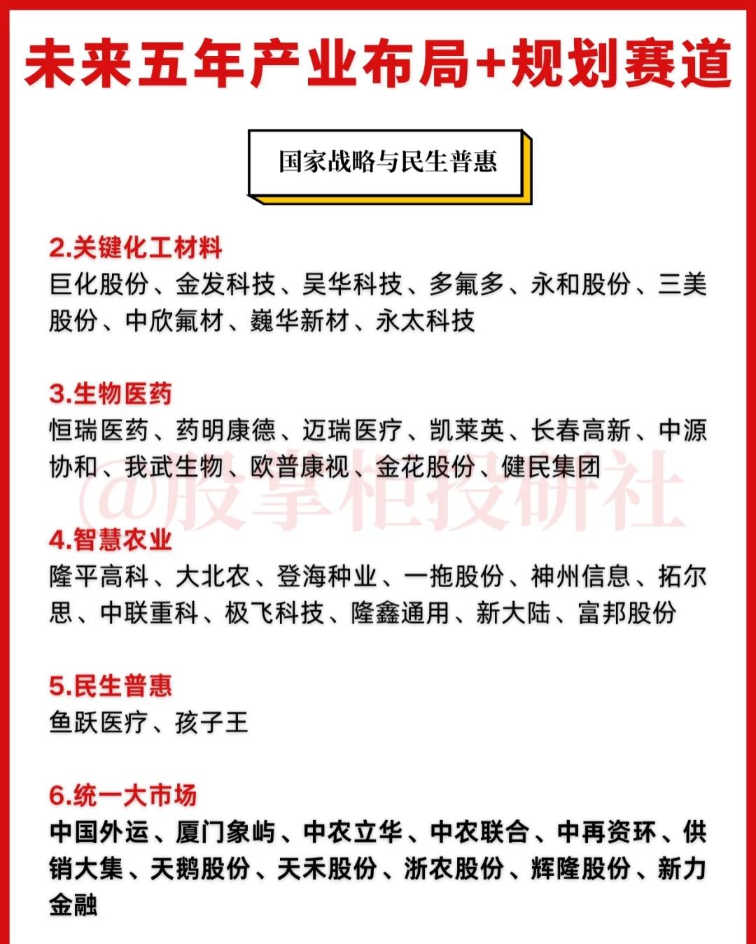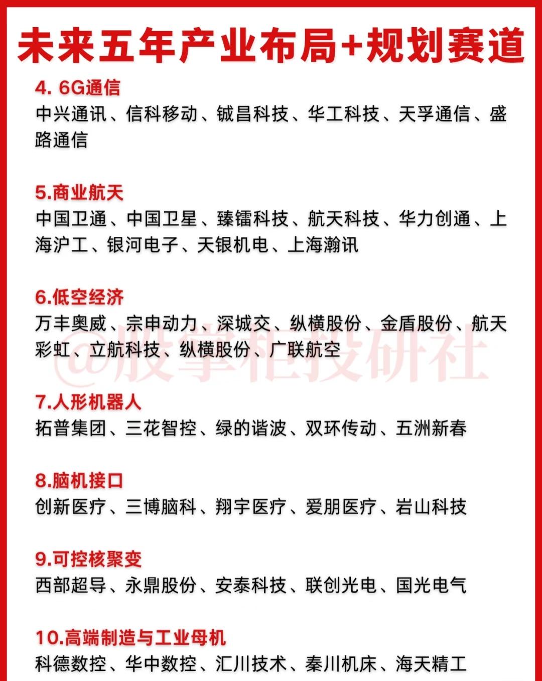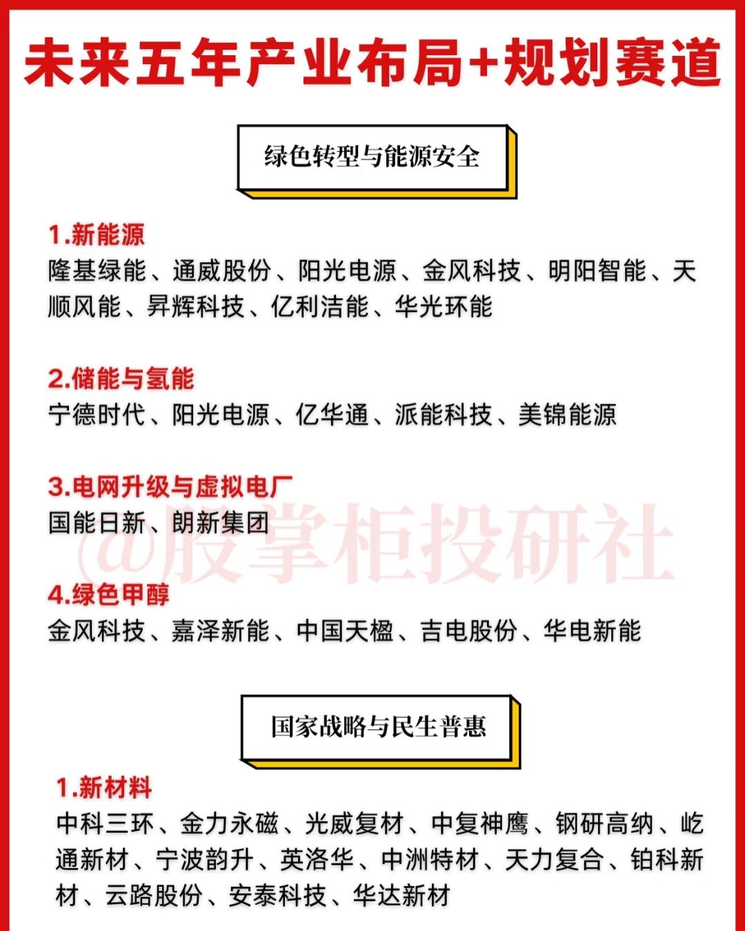 围绕“未来五年产业布局与规划赛道”这一主题,全面展示了我国在未来五年重点发展的新兴产业与战略方向,涵盖了科技创新、高端制造、绿色转型、民生保障等多个关键领域,具体内容总结如下: 一、科技创新与新质生产力 未来五年将重点发展以人工智能、算力基础设施、半导体与国产替代、量子科技为代表的前沿科技领域,以此培育新质生产力,推动经济高质量发展。其中,人工智能与算力领域包括寒武纪、中科曙光、科大讯飞等企业;半导体与国产替代聚焦北方华创、中微公司、中芯国际等;量子科技则涵盖国盾量子、中国长城、科大国创等公司。 二、新兴支柱产业与战略增长点 规划提出要打造新能源、新材料、航空航天、低空经济等新兴支柱产业集群,同时推动量子科技、生物制造、氢能和核聚变能、脑机接口、具身智能、第六代移动通信(6G)等成为新的经济增长点。涉及的产业方向包括: - 6G通信:中兴通讯、信科移动、华工科技等; - 商业航天:中国卫通、中国卫星、航天科技等; - 低空经济:万丰奥威、宗申动力、纵横股份等; - 人形机器人:拓普集团、三花智控、绿的谐波等; - 脑机接口:创新医疗、三博脑科、岩山科技等; - 可控核聚变:西部超导、永鼎股份、安泰科技等; - 高端制造与工业母机:科德数控、华中数控、汇川技术等。 三、绿色转型与能源安全 未来五年将大力推进绿色低碳发展,重点布局新能源、储能与氢能、电网升级与虚拟电厂、绿色甲醇等方向,以保障能源安全并实现绿色转型。主要企业包括: - 新能源:隆基绿能、通威股份、阳光电源、金风科技等; - 储能与氢能:宁德时代、亿华通、派能科技等; - 电网升级与虚拟电厂:国能日新、朗新集团; - 绿色甲醇:金风科技、嘉泽新能、中国天楹等。 四、国家战略与民生普惠 此部分既包括支撑国家战略发展的关键材料与高端制造,也涵盖与民生紧密相关的产业。具体分为: - 新材料:中科三环、金力永磁、光威复材等; - 关键化工材料:巨化股份、金发科技、多氟多等; - 生物医药:恒瑞医药、药明康德、迈瑞医疗等; - 智慧农业:隆平高科、大北农、登海种业等; - 民生普惠:鱼跃医疗、孩子王; - 统一大市场:中国外运、厦门象屿、中农立华等,助力全国统一大市场建设与供应链优化。 综上,系统梳理了未来五年中国在科技创新、新兴战略产业、绿色低碳、高端制造、民生福祉等关键赛道上的布局方向与代表企业,为把握未来产业发展趋势和投资机会提供了重要参考。