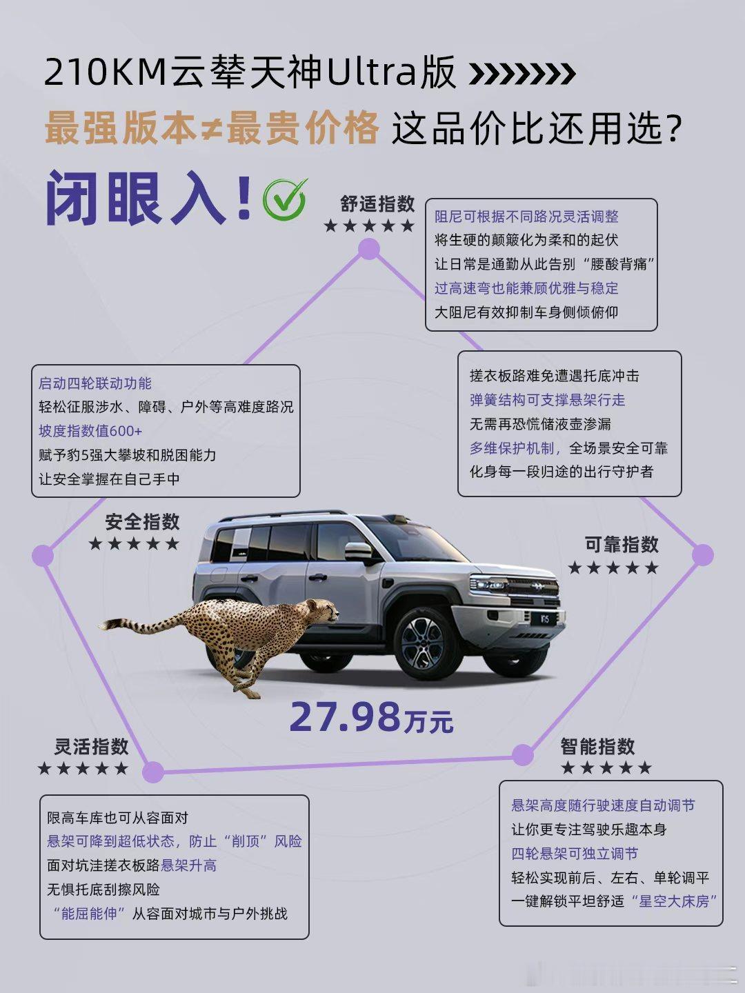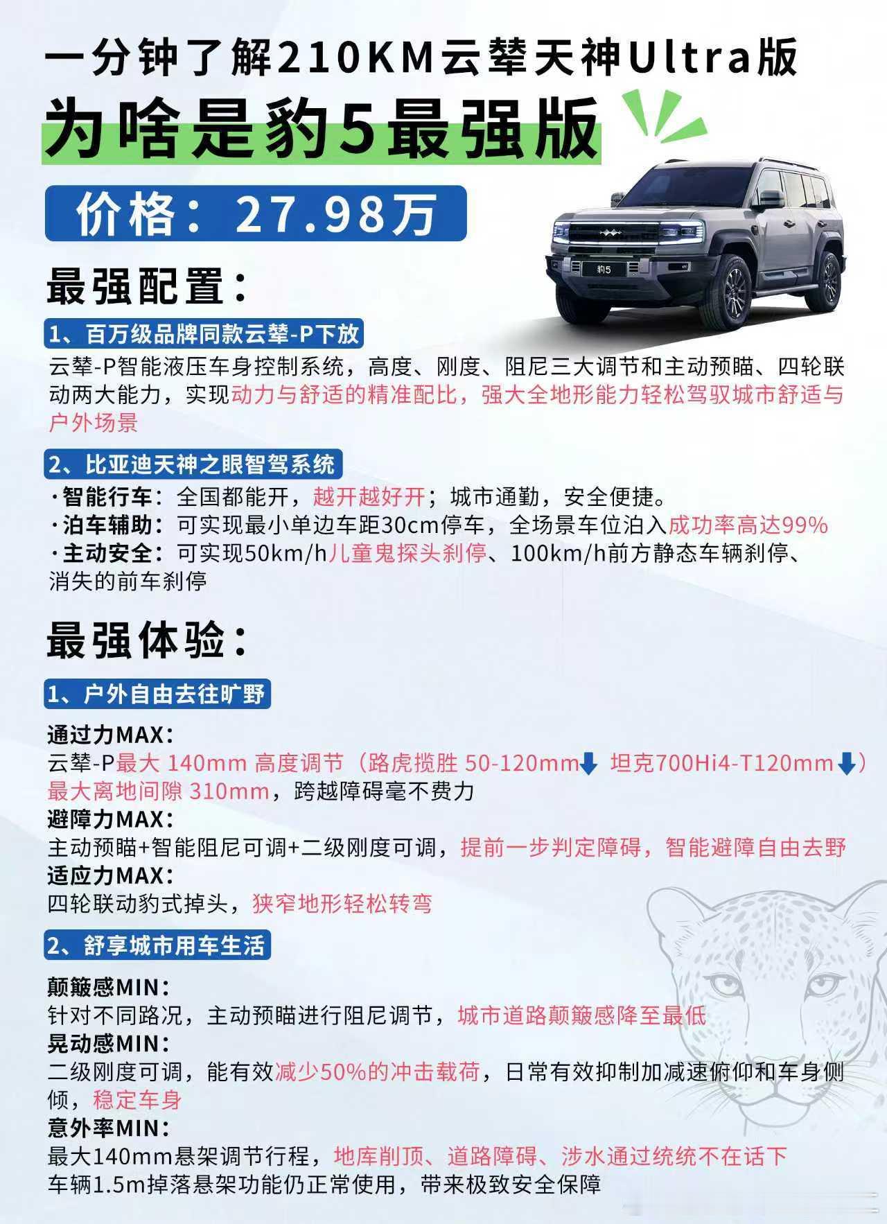 一图看懂为什么说210km云辇天神Ultra版是豹5最强版,百万级品牌同款云辇-P下放+天神之眼智驾系统,户外MAX表现+城市极致舒享,最强配置+最强体验,共同铸就豹5最值云辇版!比亚迪比亚迪[超话]方程豹[超话]