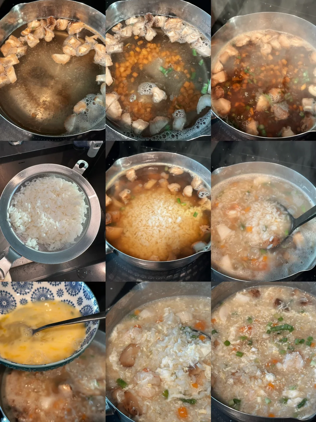 再次沸腾后,用冷水冲一下剩米饭,沥干后加入锅里,煮5分钟;