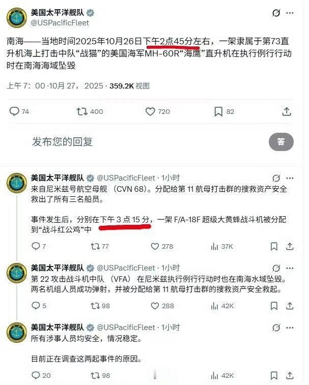 老特前脚到达马来西亚,尼米兹航母在南海马上掉飞机,而且半小时内掉两架!分别是一架直升机与一架大黄蜂战机!该航母本来是来到马来附近的海面给大统领助威的,这两摔把面子都摔沉海底了!这摔机效率堪称和平年代之最! 虽说这南海是东大几大神仙的道场,但如果他不冒犯神仙,仙驾不会惩罚于他!嗯,是不是漂亮国发不出工资,飞行员们有意见了?…… 反正不关我们的事[白眼][白眼]