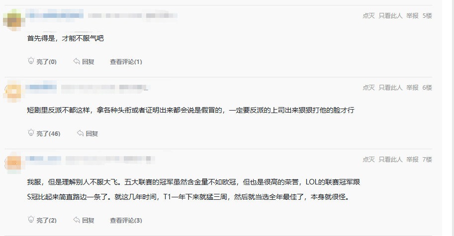 3:我服,但是理解别人不服大飞。五大联赛的冠军虽然含金量不如欧冠,但也是很高的荣誉,LOL的联赛冠军跟S冠比起来简直路边一条了。就这几年时间,T1一年下来就猛三周,然后就当选全年最佳了,本身就很怪。