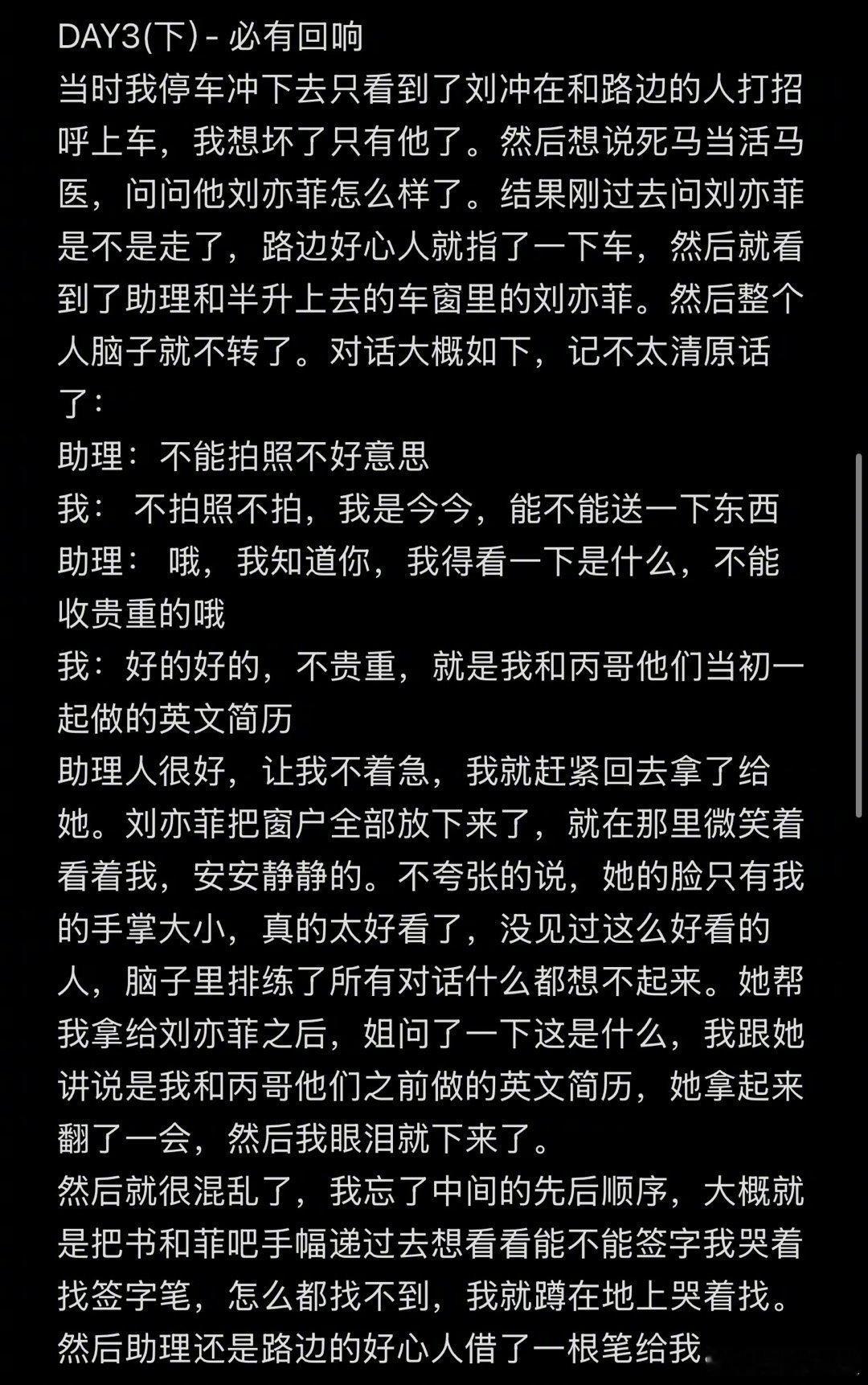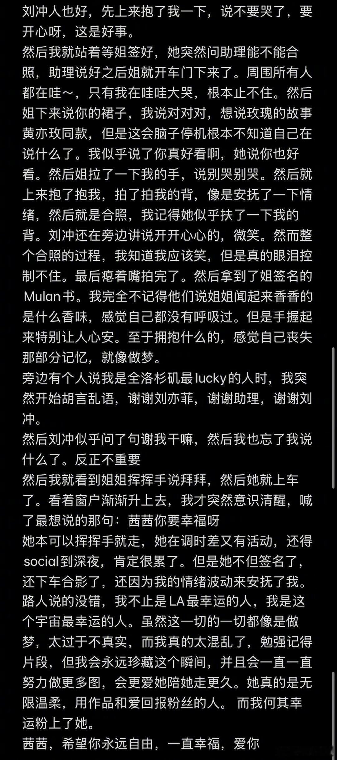 刘亦菲深夜下班后下车和粉丝合影粉丝发长文回忆和刘亦菲见面过程