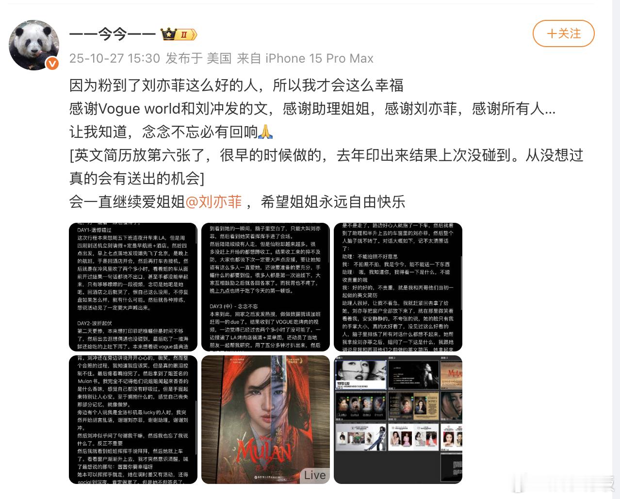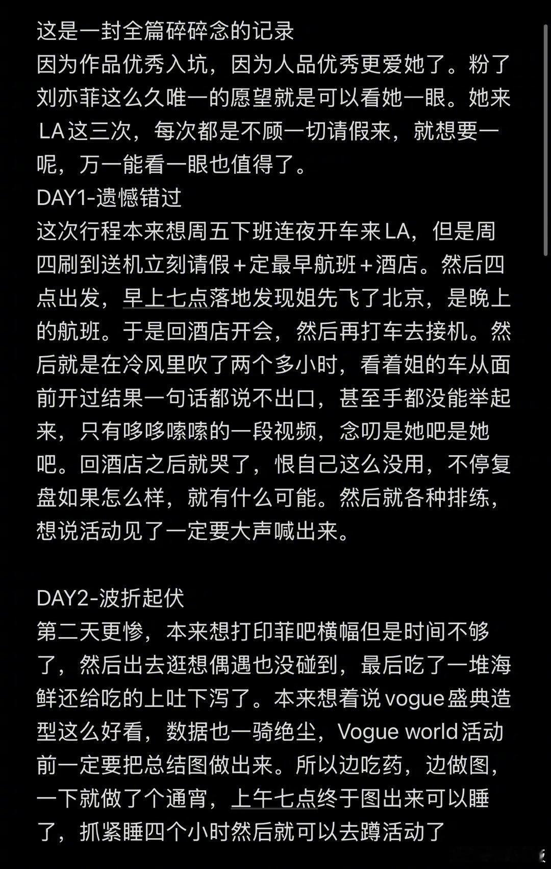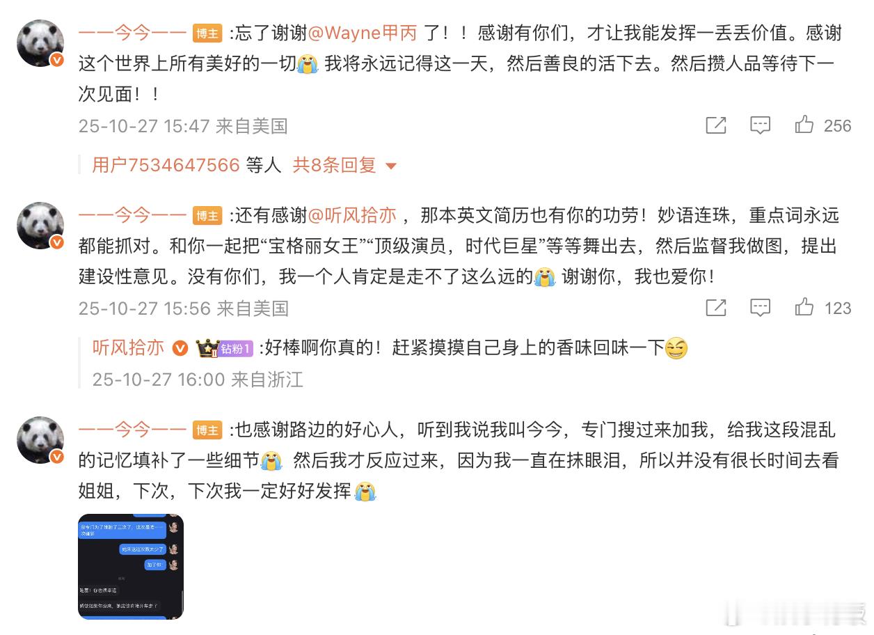 27日,一位粉丝发布长文,详细回忆了在洛杉矶与刘亦菲深夜见面的全过程:先是因行程变动遗憾错过首日见面,次日又因身体不适与刘亦菲擦肩而过,直至第三天,她在洛杉矶一家烤肉店外 “守到” 了刘亦菲的车辆。据今今描述,当时刘亦菲刚结束活动,虽处于调时差且工作至深夜的疲惫状态,但在得知自己的心愿后,仍主动摇下车窗,在和助理沟通后亲自下车。面对情绪失控落泪的今今,刘亦菲不仅温柔拥抱、拍背安抚,还主动提出合影,过程中贴心扶着今今的背调整姿态,今今在文中感慨:“她本可以挥挥手就走,却为我停下脚步,我不止是 LA 最幸运的人,更是这个宇宙最幸运的人。” 真的是好好的茜茜公主[泪] 刘亦菲[超话]