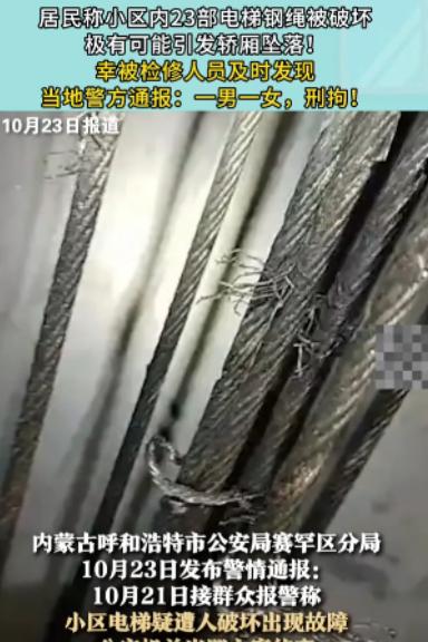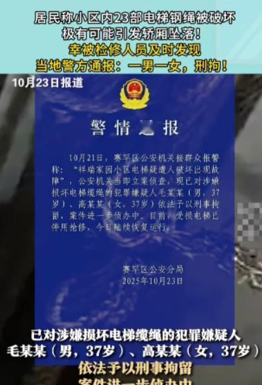 “简直坏到骨子里!”内蒙古呼和浩特,居民乘电梯时听见轿厢“咯吱咯吱”异响,赶快下电梯后告知物业,维保人员检查后,倒吸冷气,原来23部电梯的关键承重钢绳全被人故意割断!这简单拿居民生命当儿戏,要是没人及时发现,满载乘客的电梯失控坠落,后果根本不敢想!居民们又慌又气,报警后,帽子叔叔很快抓住犯罪人员。 2025年10月的一个清晨,内蒙古呼和浩特市某小区的居民像往常一样,匆匆忙忙地下楼上班。早晨7点20分左右,7号楼的居民张女士走进电梯,准备下到一层。 刚按下楼层按钮,电梯轿厢却突然发出“咯吱咯吱”的刺耳异响——那种声音像是金属在被强行拉扯、摩擦,带着一阵令人头皮发麻的颤动。 她的心猛地一紧,本能地感觉到不对劲。电梯还没到一楼,轿厢就出现了轻微的抖动。张女士立刻按下“开门”键,好在电梯门刚好在三楼停下,她赶紧冲了出去,心口怦怦直跳。 她透过缝隙朝轿厢里望去,只见几根承重钢绳表面隐隐有些毛边,像是被什么锋利的东西划过。她吓得赶紧跑去通知物业。 十分钟后,小区物业经理和维保人员赶到现场。维保师傅姓赵,干电梯维护十多年,经验丰富。他俯身查看钢绳时,眉头越皱越深。 手电筒一照,只见电梯的主承重钢绳上布满一道道细长的割痕,几乎每一根都被人用刀具割断了三分之二! “这不是自然磨损,这是人为破坏!”赵师傅沉声说道。 物业经理听完,脸色瞬间煞白。电梯钢绳一旦完全断裂,整个轿厢将如断线风筝般坠落,瞬间车毁人亡!想到小区有老人、小孩每天乘电梯上下,他不寒而栗。 更可怕的是,随后的检查结果让所有人都倒吸一口凉气——整个小区共有23部电梯,几乎每一部的钢绳都有不同程度的割痕,全是被人蓄意破坏的! 物业立刻报警。 呼和浩特市公安局赛罕分局刑侦大队接到报警后,第一时间派出警力封锁现场,并调取了小区的监控录像。 民警很快在多个楼栋监控中发现了可疑身影——一男一女,夜间多次出现在电梯机房附近,行迹诡异。两人都戴着帽子和口罩,但仍被警方锁定了体貌特征。 根据时间线推算,他们作案至少有两晚。监控中,男子多次背着工具包进入电梯井,女子在一旁放哨。 警方迅速展开追查,通过车辆轨迹和出入登记,很快确定两人的身份:37岁的毛某某,男,小区附近一家废品收购站的雇员;另一名则是他的同龄女友高某某,无业。 当天傍晚,警方在城南一处出租屋内将两人当场抓获。 面对审讯,毛某某起初还试图狡辩,声称自己只是“去修电梯看看”。可当警方拿出监控录像、作案工具以及他鞋底残留的钢绳碎屑时,他彻底崩溃,低头认罪。 原来,毛某某此前因与物业有过节。几个月前,他曾在小区做临时保洁,被物业辞退,还因为乱丢垃圾被罚了款。 他心中怀恨,在高某某的怂恿下,决定“出气”。二人趁夜潜入电梯机房,用铁锯和刀片一点点割断钢绳。 据他们供述,之所以没有一次割断全部,是担心电梯立刻坠落引起注意,他们想“让物业慢慢吃苦头”,但没想到竟然差点酿成惨剧。 案件细节曝光后,全小区居民无不心惊胆战。有人感叹:“我们每天都坐那电梯,要是没被发现,真可能全家都没了!” 维保公司连夜更换了全部钢绳,公安部门也对物业管理漏洞进行了通报整改。警方随后表示:毛某某和高某某的行为已构成以危险方法危害公共安全罪,一旦造成后果,最高可判死刑。 案发后,张女士也多次被邻居称作“救命恩人”。若不是她那天机警地发现异常并立即报警,后果将无法估量。 公安机关发布的警情通报中写道:“电梯承重钢绳遭人为破坏,性质极其恶劣,手段极其残忍。两名嫌疑人对社会公共安全造成严重威胁,依法应予严惩。” 如今,小区电梯已全面恢复运行,但许多居民仍心有余悸。有人说,这件事让他们第一次真正意识到——所谓的“安全”,其实往往建立在一念之间。