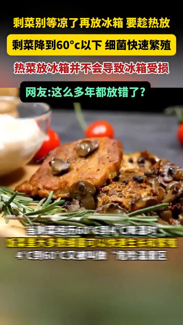 剩菜别等凉了再放冰箱,要趁热放。剩菜降到60°以下细菌快速繁殖,热菜放冰箱并不会导致冰箱受损。网友:这么多年都放错了? 健康时报报道:热菜放入冰箱虽然会短暂升高冷藏室的温度,但冰箱并不会受损。冷藏室会尽快恢复低温状态,多消耗的电仅相当于多开几次冰箱门。当剩菜经历60°C到4°C降温时,饭菜里大多数细菌可以快速生长和繁殖,4°C到60°又被叫做"危险温度区。因此剩菜还是要趁热放入冰箱,不然室温下放得越久细菌繁殖越多。 食物放冰箱要把握两个关键:趁热+密封。可以提前用保鲜盒或保鲜袋装好,密封室温下放一会儿。在不低于60°C(感觉到烫但不会烫伤)之前放进冰箱冷藏或冷冻保存。隔夜剩菜 谨慎食用剩菜