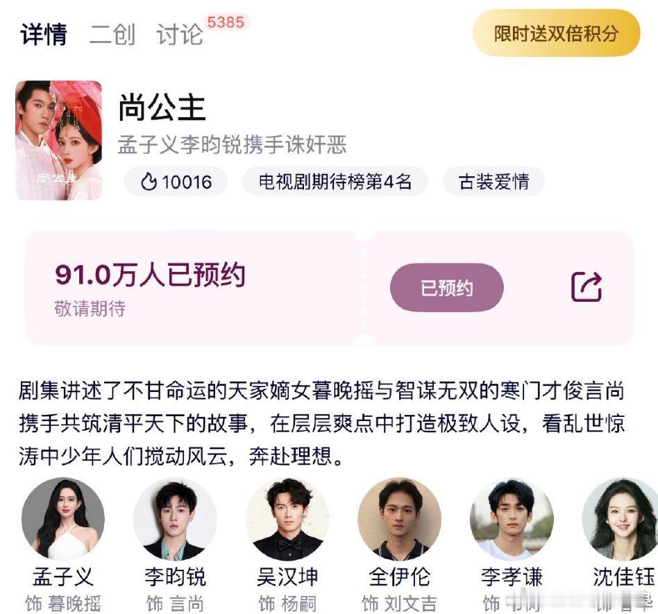 孟子义、李昀锐《尚公主》腾讯视频站内热度破万!