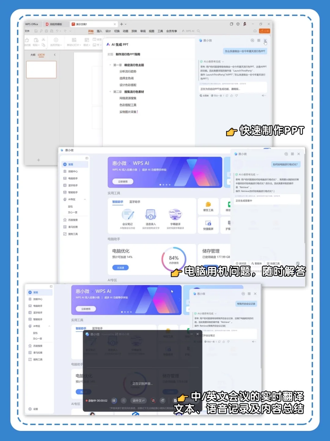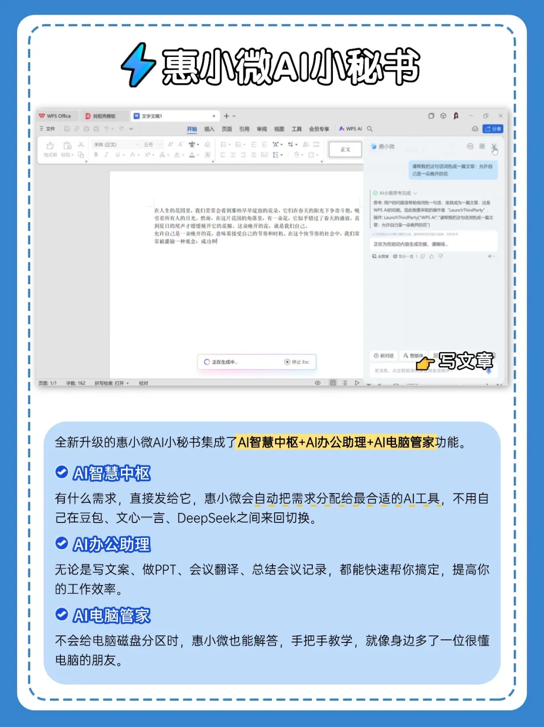 都搭载了贴心的惠小微AI小秘书,无论是写文案、做PPT、会议翻译、总结会议记录,一整套工作流直接帮你快速搞定