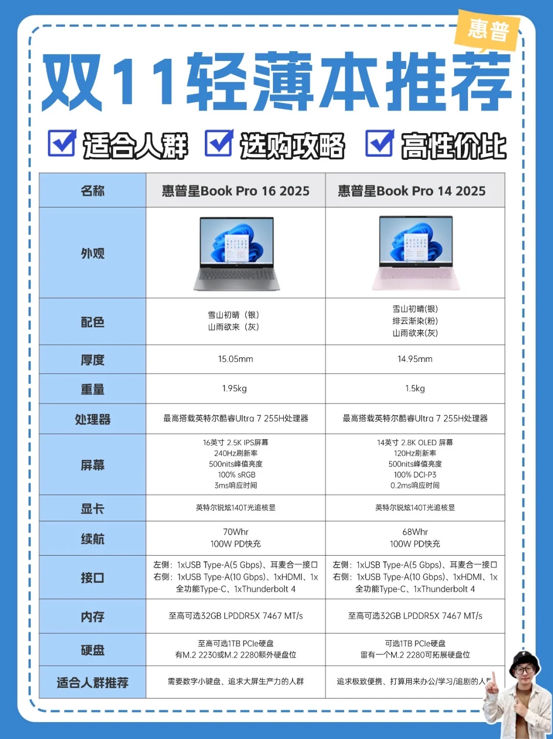 追求大屏生产力选惠普星Book Pro 16 2025;追求极致便携,打算用来办公/学习/追剧,选惠普星Book Pro 14 2025。双11期间入手很划算,部分地区还可享至高20%的家电补贴
