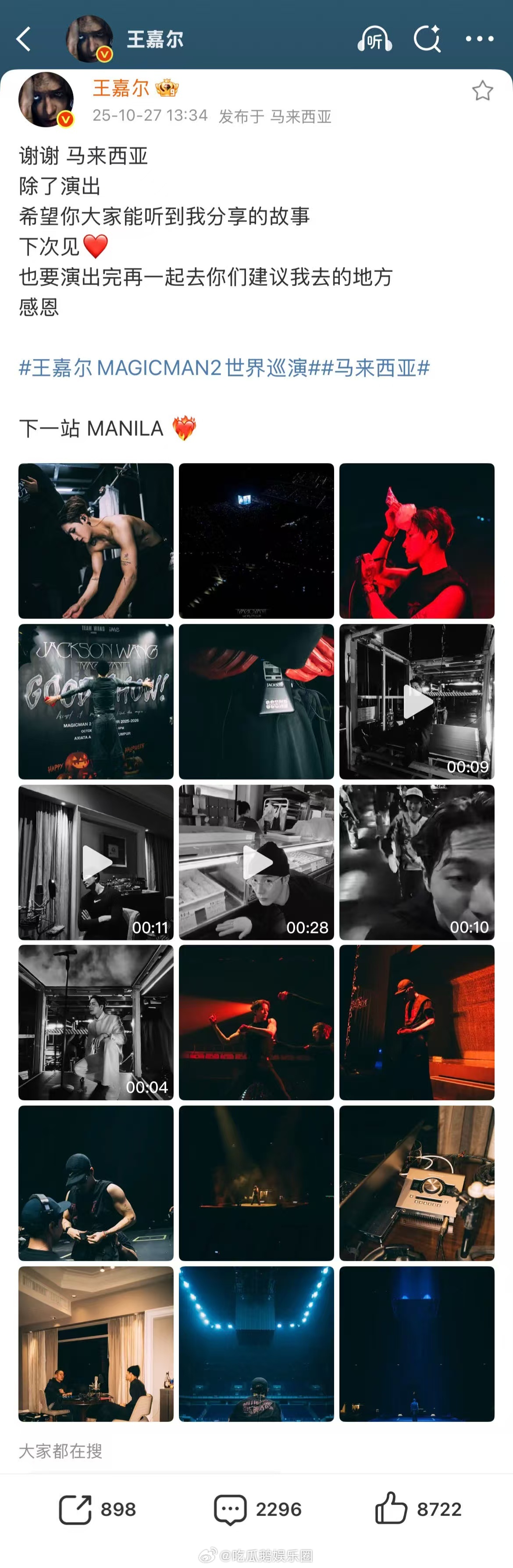 王嘉尔一口气晒21张巡演日常 用21张巡演日常“承包”屏幕!吉隆坡万人场威亚开唱帅到失语,转头就用美食打卡照萌化人心,舞台王者与“干饭大朋友”的双重魅力,谁能抵得住!