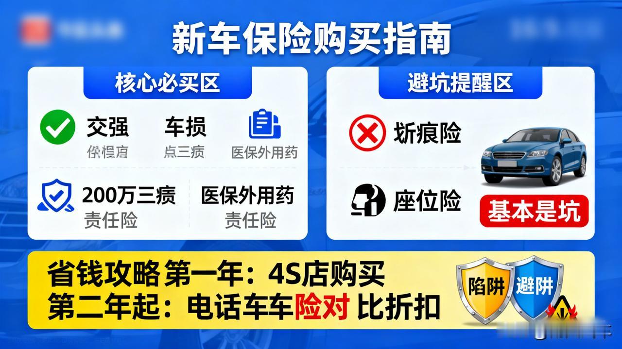 新车第一年,保险怎么买最划算? 交强、车损、三责(建议200万起)、医保外用药责任险。划痕险、座位险这些基本是坑。 第一年通常在4S店买,第二年开始电话车险折扣最大,记得对比几家。 保险选购指南 保险选购攻略 车损保险 车辆保险 新车保险 保险避坑攻略 新车车险