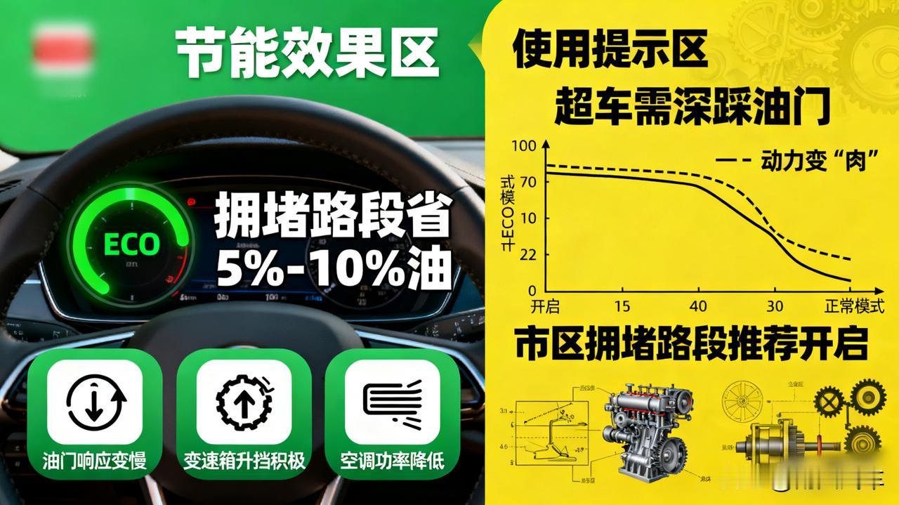 市区开车,ECO节能模式真的有用吗? 有用!ECO模式会让油门响应变慢,变速箱升挡更积极,空调功率也可能降低。长期在拥堵路段使用,能省下5%-10%的油。 代价就是动力变“肉”,超车要深踩油门。 高速省油技巧 自动启停技术 省油驾驶方法 低油耗驾驶技巧 高速省油误区 省油教程 汽车eco模式