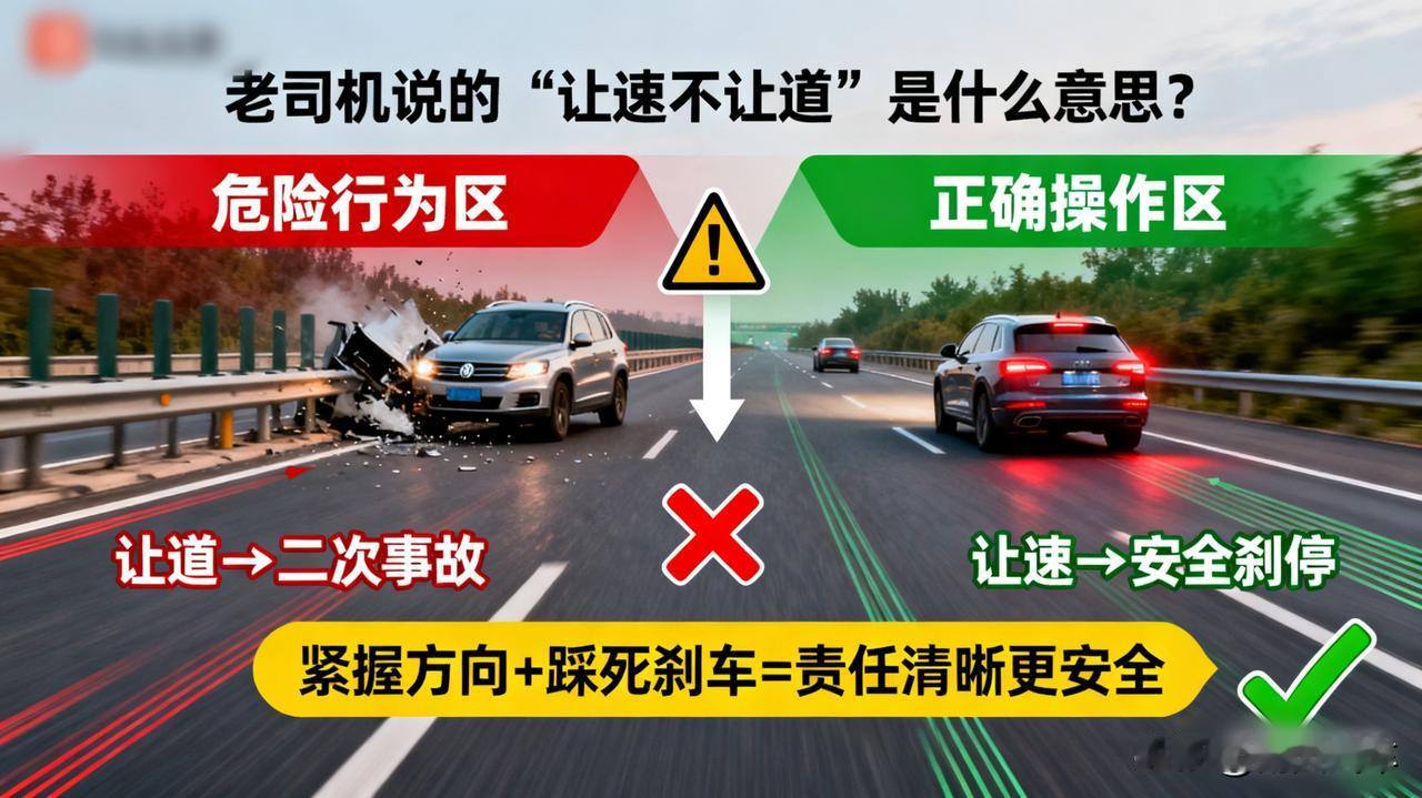 为什么老司机常说“让速不让道”? 前方有车突然加塞,或路口有鬼探头,本能反应是打方向躲避,这极易引发更严重的二次事故(如撞护栏、与旁车相撞)。 正确的做法是紧握方向,第一时间踩死刹车,在自已车道内刹停,责任清晰,最安全。 高速让速不让路 会车让车 拐弯不超车 高速路加塞 交替行驶规则 车加塞 加塞现象