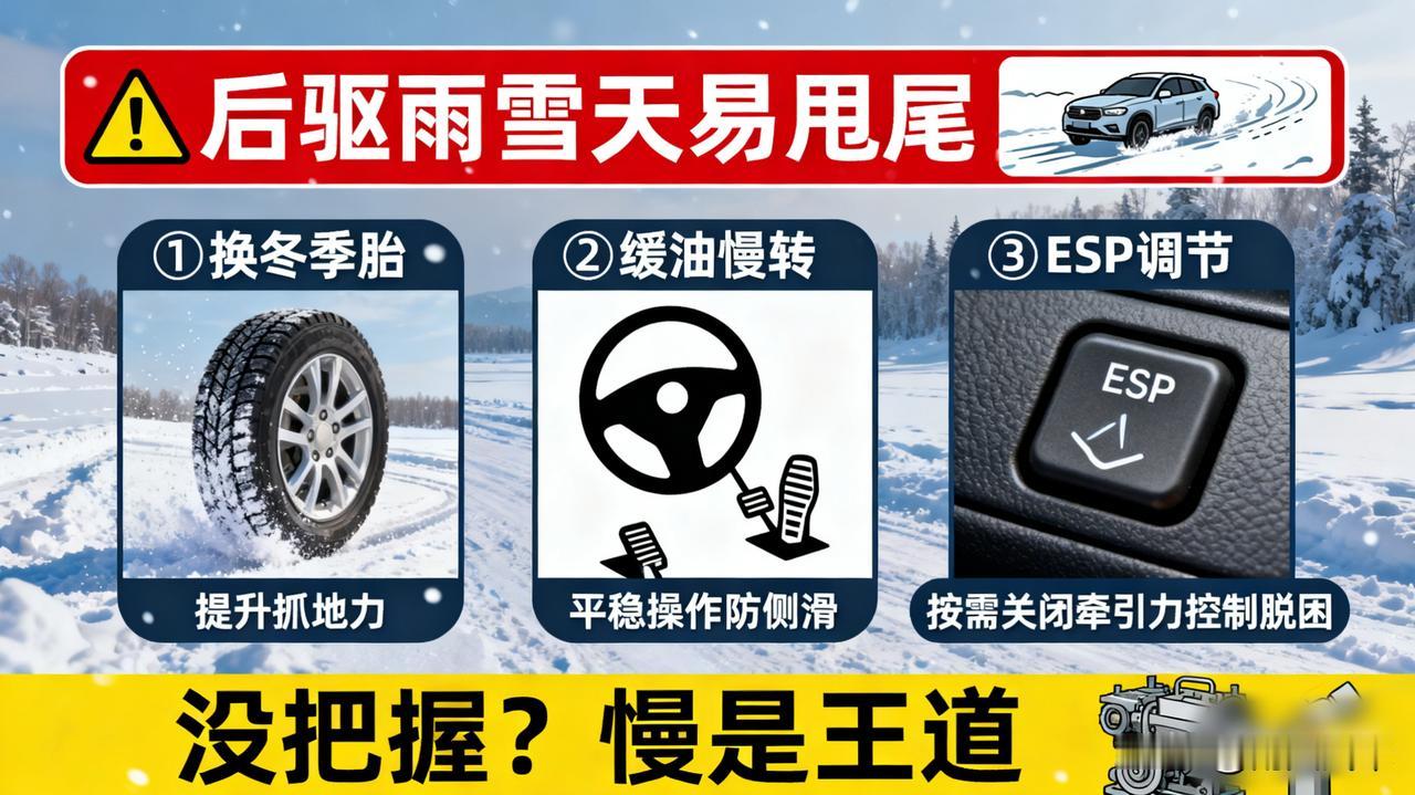 后驱车雨雪天是“噩梦”?老司机教你怎么办。 后驱车在湿滑路面容易甩尾。解决方法是:①换冬季轮胎 ②缓给油,慢转弯 ③关闭车身稳定系统(ESP)的牵引力控制部分(按需),帮助脱困。 没把握的话,慢是王道。 冬季热车 后驱动力 雪地热车 车后怪象 后驱车底盘异响 后驱漂移车 热车工况