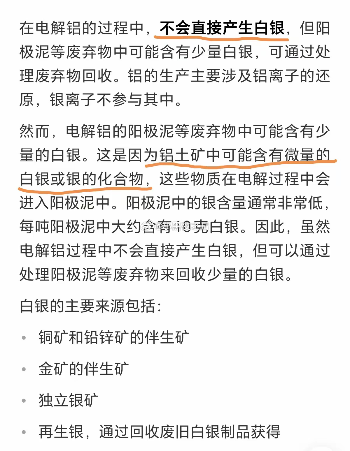 很多人说电解铝产生白银,以为白银是凭空产生,以为可以凭空制造白银。其实是误解,铝矿中银作为伴生矿少量存在,在电解铝过程中,这部分银会被回收起来而已。