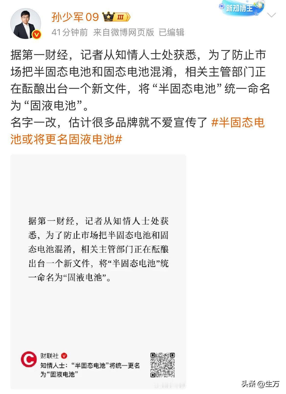 孙少军:为了防止市场把半固态电池和固态电池混淆,相关主管部门正在酝酿出台一个新文件,将“半固态电池”统一命名为“固液电池”。 看来现在,大家对固态电池的命名,以及它的真实性,还是比较在乎的。 无论是电池生产商,还是使用这个电池的汽车品牌方,以及对整个行业进行监管的相关部门,对固态电池的保护还是比较严谨的 。 他们已经发现,虽然固态电池还没有完全出来,可是现在已经有品牌方,悄悄地搞了一个新的所谓“半固态的电池”这种说法,这你受得了吗? 所以,为了把这个事情的概念搞清楚,要把这种所谓的固态电池,搞一个新的名字,就叫做: 固液电池。 当然,这样做的目的是非常明确的,就是要告诉消费者,这种电池,他其实不属于固态电池,它与固态电池没有任何关系。 因此,先从源头上把这个事情分清楚了,有利于接下来市场的良性发展。来看的市场还是比较宽广的,很多人都在等这种技术出来,因为对于电车来说,相对比较安全的电池技术,目前来讲就是固态电池。