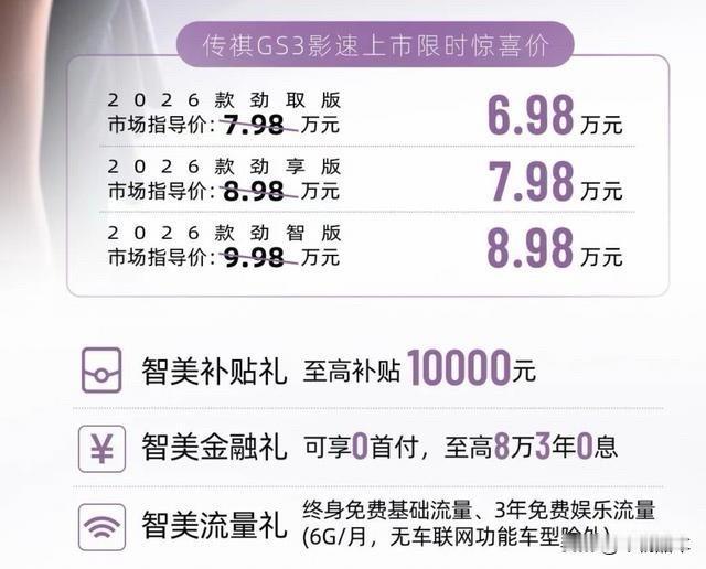 网传成真!2026款传祺影速10月27日正式上市,限时惊喜价6.98万元起,这价格谁能不心动?和老款比,对应车款售价下调6000元。 它外观尺寸是4410x1850x1600mm,轴距达2650mm,妥妥小型SUV。内饰更新为星光黑,还配有1.5T四缸发动机,最大功率130kW。智能化也升级了,有14.6英寸中控屏,顶配还有星灵智行泊车辅助系统。首发能享至高1万元补贴、8万3年0息等福利。这性价比,简直是打工人的福音! 广汽传祺昊铂 传祺g影速 传祺影速动力强 传祺影速荣耀版 传祺影速劲智版 东莞传祺影速 传祺影速4s店 传祺GS3影速