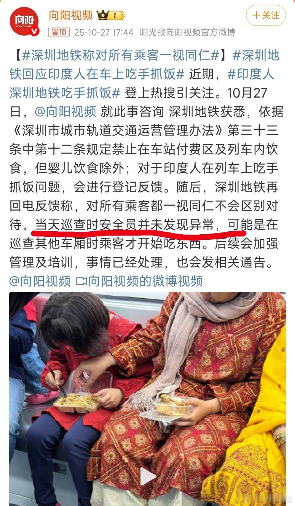 深圳地铁回应印度人在车上吃手抓饭网友爆料的说法和地铁方的说法有出入,到底巡查时有