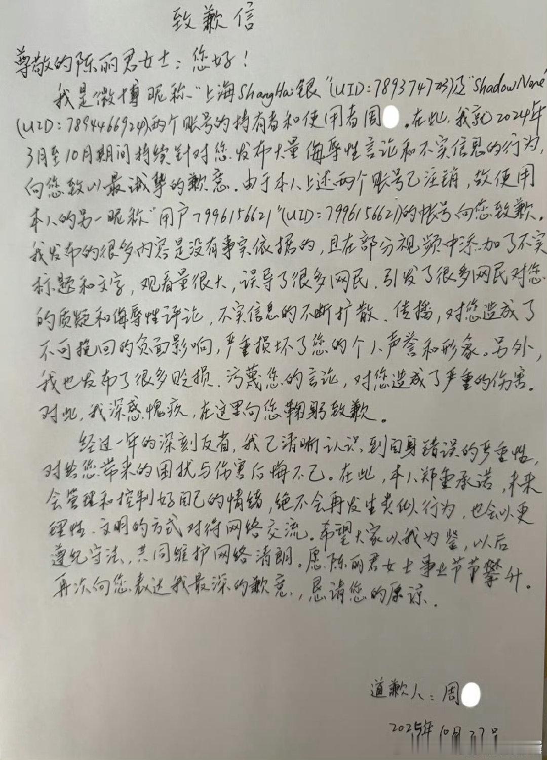 黑粉向陈丽君女士公开视频致歉及手写道歉信致歉!! 支持维权💪