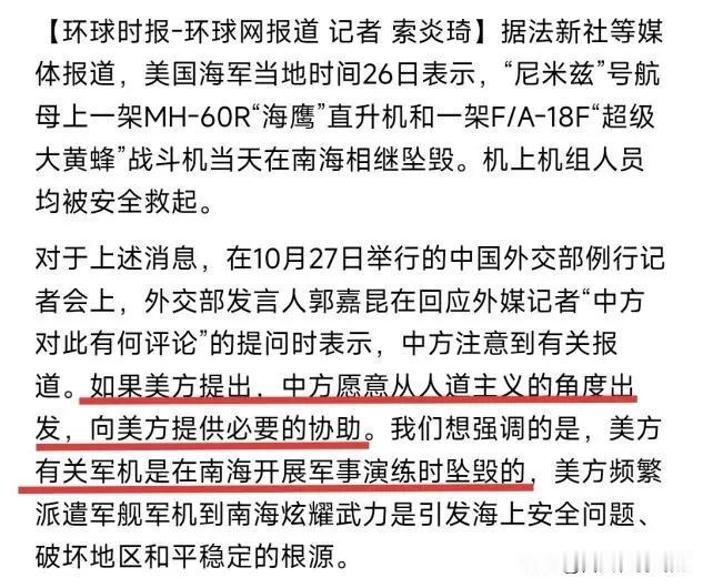 中方回应美军南海坠机,愿提供人道主义协助 10月27日,外交部例行记者会上,发言人就美军南海两机坠毁事件作出回应,一番表态既点明核心症结,又彰显大国格局,引得中外网友纷纷点赞,直呼“贴脸开大”“杀人诛心”。 发言人明确指出,表示中方愿从人道主义角度出发,为美方提供必要协助。这短短两句话,一边戳破美方霸权行径的本质,一边展现包容姿态,一硬一软之间,尽显外交智慧,也让美方陷入进退两难的尴尬境地。 谁能想到,几天前还气焰嚣张的美军,如今却沦为国际笑柄。美方此前高调宣称,让“尼米兹”号航母在退役前赴南海开展“最终部署”,是向所谓“中方海上野心”发出的“强烈信号”。 可这份炫耀武力的宣言余音未散,部署仅一周时间,这艘航母就上演了惊魂一幕——10月26日下午,30分钟内接连有两架舰载机坠入南海,MH-60R“海鹰”直升机与F/A-18F“超级大黄蜂”战斗机先后失控坠海。 5名机组人员虽死里逃生,却早已吓得魂飞魄散。这般狼狈景象,何尝不是另一种“强烈信号”?不过信号传递的不是威慑,而是美军自身的混乱与窘境。 网友口中的“杀人诛心”,恰恰体现在中方“人道主义协助”的邀约上。美军早已公开宣布,坠海飞行员均已成功获救,眼下最棘手的难题,分明是打捞坠入南海的两架军机。 南海海域水深难测,部分区域深度超数千米,海底地形复杂,洋流变幻莫测,想要打捞先进战机绝非易事。美军虽装备精良,却在远海打捞领域存在短板,缺乏适配的专业设备与足够的现场支援,想要完好回收战机残骸,难度堪比登天。 更关键的是,这些坠海战机搭载着美军核心军事技术,一旦残骸被他国获取,后果不堪设想。美军自然不敢放任不管,可真要动手打捞,面对茫茫深海与复杂环境,恐怕只能束手无策。 中方此时主动提出协助,无异于递上一根“救命稻草”,却也让美方陷入两难抉择。接受协助?此前刚放完狠话,如今转头求助被自己“警告”的对象,颜面何在?不接受? 战机残骸长眠海底,技术泄密风险与日俱增,损失难以估量。这种“给你台阶你不敢下”的局面,难怪网友会调侃“这波操作太绝”。美军在南海的尴尬处境,完全是自食其果。 近年来,美方打着“航行自由”的幌子,频繁派遣航母、战机闯入南海,抵近侦察、开展军事演习,年均出动军机千余架次、军舰百余艘次,把这片和平海域搅得乌烟瘴气。 美国太平洋舰队虽已确认坠机事实,却对详细原因讳莫如深,但外界普遍猜测,除了可能的装备老化、维护不足问题,频繁高强度起降训练、急于炫耀武力导致的操作失误,或许也是重要诱因。 毕竟美军舰载机部队长期面临机体老化、维护压力大的困境,在南海这般敏感区域强行秀肌肉,出事只是早晚的事。 中方的回应,既不是落井下石,也不是刻意羞辱,而是基于客观事实的理性表态。 人道主义精神本就是国际社会的共同准则,中方此举既符合国际惯例,也展现了大国应有的担当。反观美方,长期将南海视为“演兵场”,无视地区国家的和平诉求,动辄以武力相威胁,如今自食恶果,完全是霸权思维作祟的必然结果。 网友的热议背后,是对美方双重标准与霸权行径的不满。美军在全球各地挑起冲突、炫耀武力,却容不得他人维护自身合法权益。此次南海坠机事件,不过是美军全球霸权的一个缩影。 看似强大的军事机器,在脱离理性轨道的扩张中,早已埋下诸多隐患。中方的人道主义协助邀约,更像是一面镜子,照出美方的傲慢与脆弱,也让国际社会看清谁才是地区和平的维护者,谁才是局势动荡的制造者。 美方此刻怕是肠子都悔青了。若当初不执意派航母赴南海挑衅,何至于落得这般狼狈?若不高调宣扬“最终部署”的威慑意图,何至于如今颜面尽失?现在面对中方的善意邀约,接也不是,不接也不是,只能在全世界的围观下,为自己的霸权行径买单。 南海不是美方的“后花园”,更不是其耀武扬威的“舞台”。中方始终坚持维护南海和平稳定,主张通过对话协商解决分歧,而美方的频繁挑衅,只会加剧地区紧张局势,最终反噬自身。 此次中方的回应,既是外交层面的高招,也是对美方的一次善意提醒:霸权之路行不通,唯有尊重彼此、平等相待,才能实现共赢。 美军接下来会如何抉择?是放下身段接受协助,还是硬着头皮自行打捞?无论结果如何,这起事件都已成为深刻教训。中方的人道主义姿态赢得了国际社会的认可,而美方的尴尬处境,也再次印证了“多行不义必自毙”的朴素真理。 希望美方能够吸取教训,停止在南海的军事挑衅,回到和平谈判的轨道上来,否则未来只会遭遇更多“诛心”时刻。