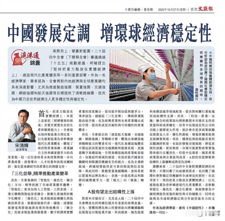 中国发展定调,增环球经济稳定性。作者系经济学家宋清辉,全文部分内容摘录如下:乘势而上,擘画新蓝图。二十届四中全会(下简称全会)审议通过“十五五”规划建议,明确提出“坚持把着力点放在实体经济上”、建设现代化产业体系等一系列重要部署。作为一名经济学家,笔者认为,全会将对内地经济与全球产业链均具有深远影响,尤其为推进制造强国、质量强国、交通强国、网络强国和航天强国等目标提供了清晰路线图,从而为中国乃至世界经济注入更多稳定性与确定性。 首先,把着力点放在实体经济上,本质上是要把“经济发展的根基”夯实在实实在在的生产和服务能力上。全会提出保持制造业合理比重、以先进制造业为骨干构建现代化产业体系,体现了政府对产业基础、产业链自主性和国家竞争力的高度重视。这一定位意味着未来政策将进一步向产业政策、投资导向、人才培养和技术攻关倾斜,强化从基础研究到产业化的闭环支持。
