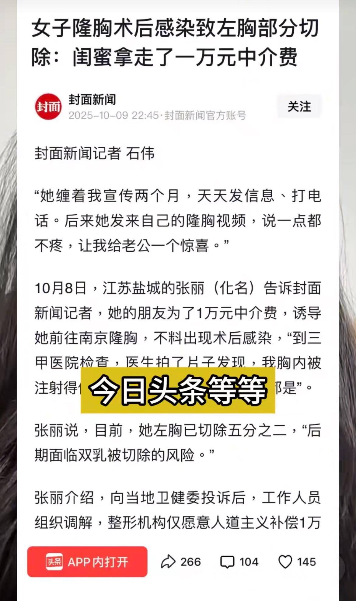 江苏盐城女子被闺蜜诓骗,去南京隆胸,结果隆胸失败被感染。防火防盗防闺蜜,真理啊。