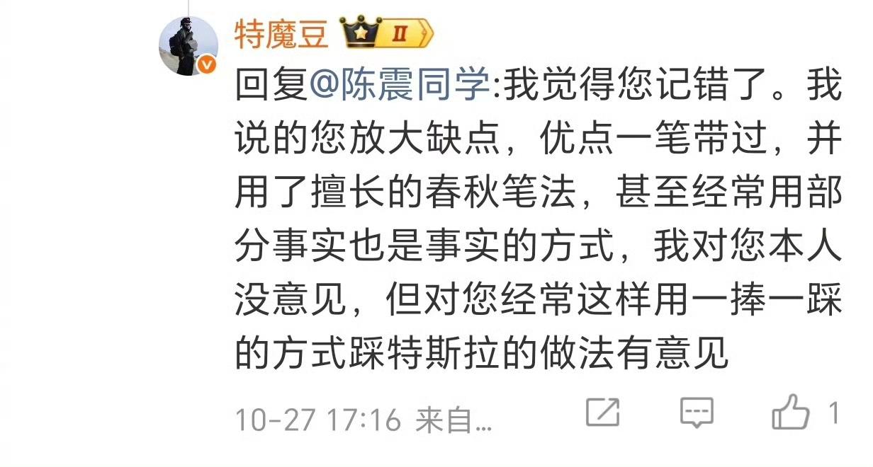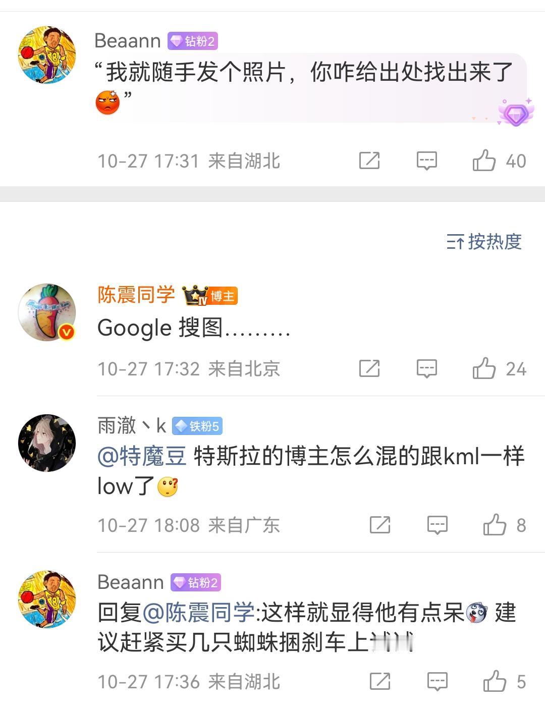 陈震:来,您具体说说,我怎么春秋笔法了?怎么忽略特斯拉的优点了?? 另外我还想指出!您从海外搬家图片没问题,但文案如果不写清楚地点,会很大程度上误导消费者!! 作为特斯拉的忠实粉丝兼特斯拉内容的专业博主,发的图片还是从海外搬家搬回来的。 结果原作者在陈震的微博下面留言了,因为这个图片是他在海外发布的。这位作者说这样显得他很呆,建议那位特斯拉博主买几个蜘蛛放在刹车上试一试。 其实博主之间讨论没有什么问题,有时候故意误导消费者就有问题了比如说可以不踩刹车,这不就是误导吗?