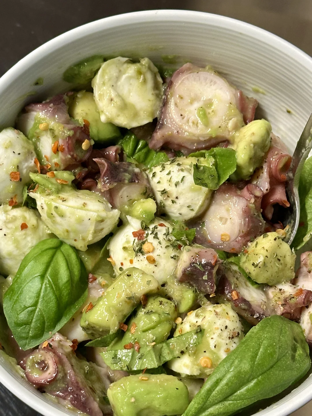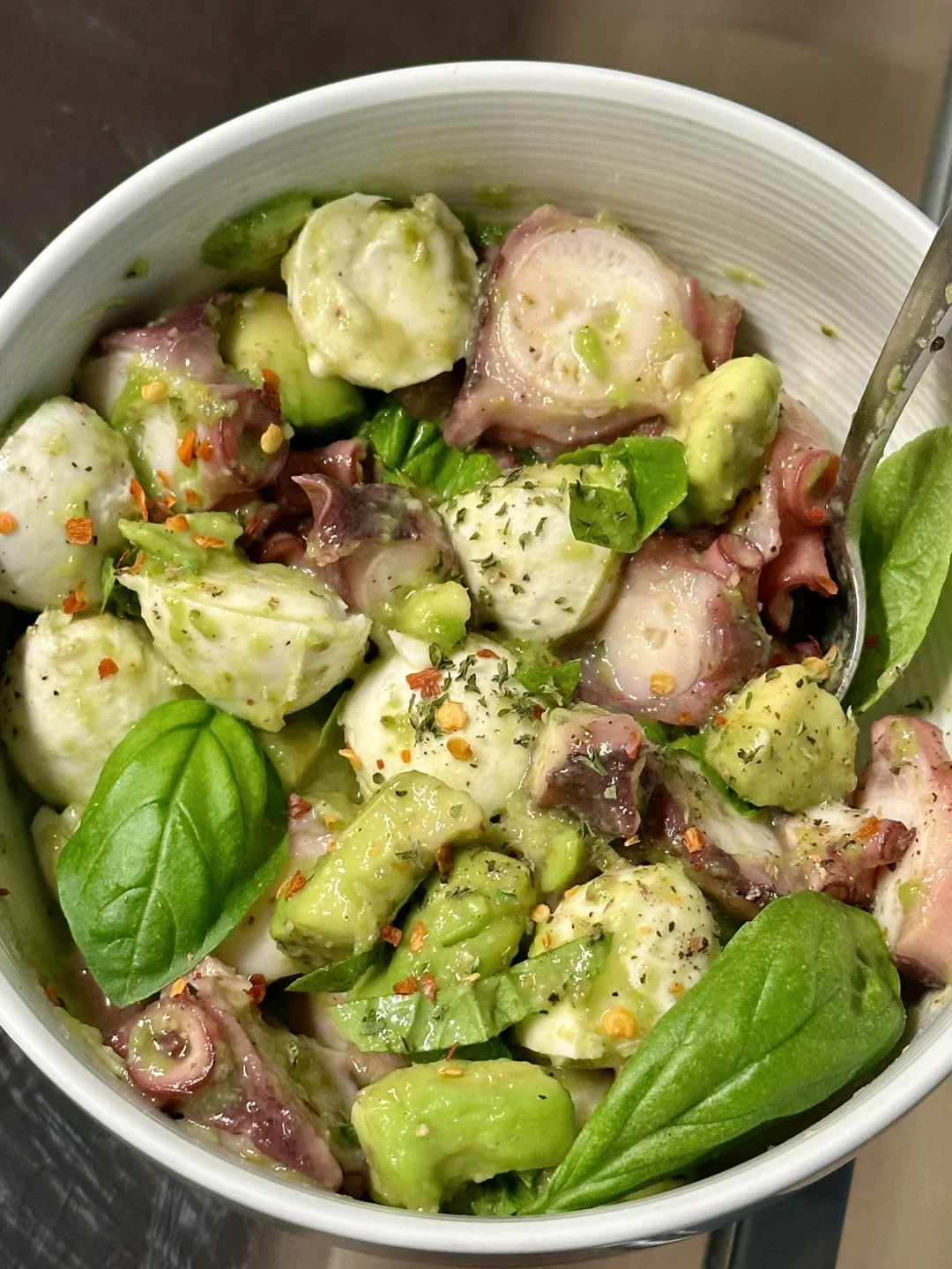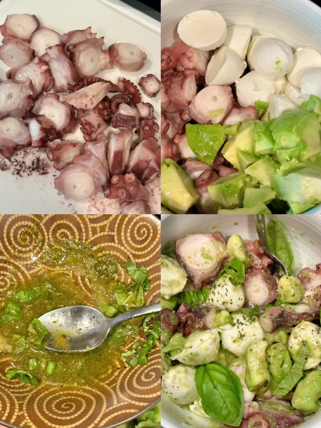 依稀记得之前刷到过一个马苏里拉牛油果章鱼沙拉,用青酱和柚子胡椒调味,典型的和风洋食。之前苦于没有食材,现在我可以轻松还原了!