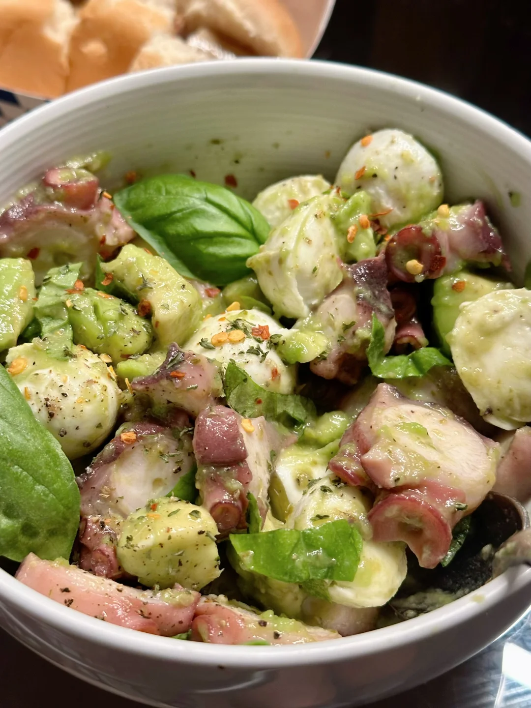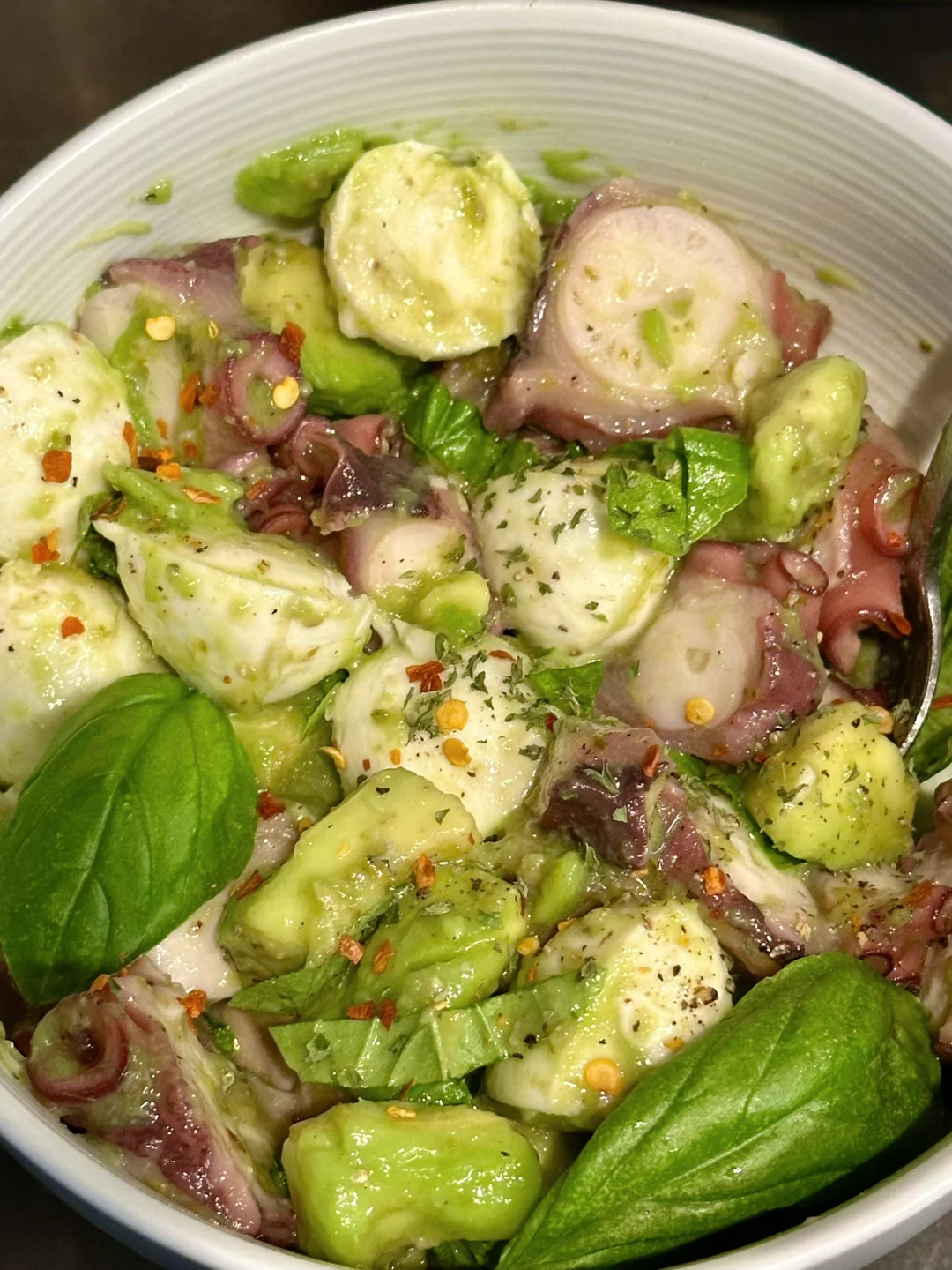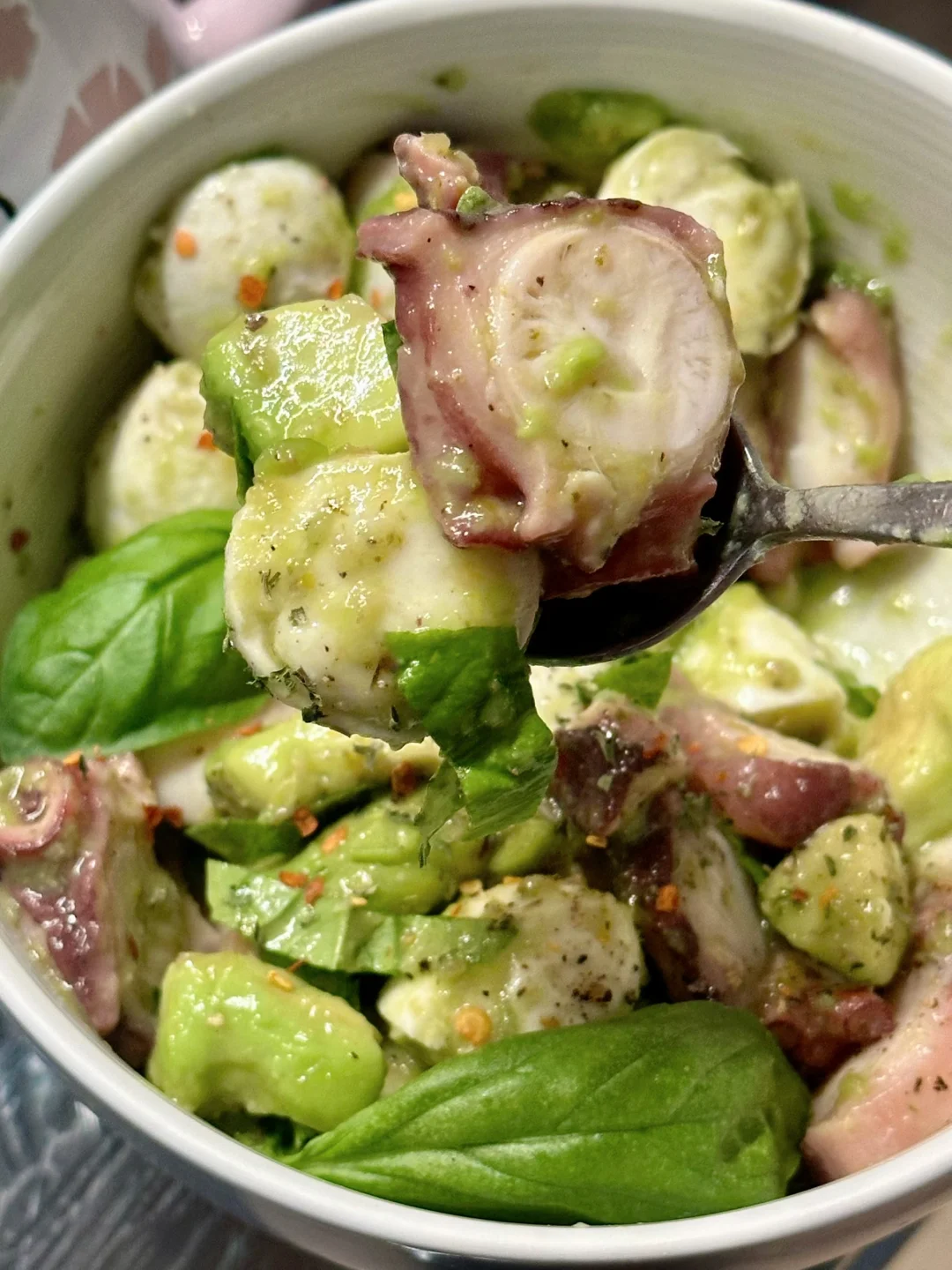 依稀记得之前刷到过一个马苏里拉牛油果章鱼沙拉,用青酱和柚子胡椒调味,典型的和风洋食。之前苦于没有食材,现在我可以轻松还原了!