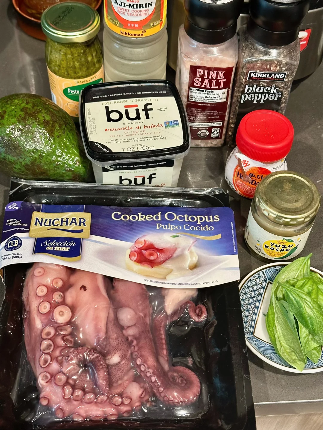Costco即食章鱼尾1-2条,牛油果半个,马苏里拉奶酪小球5-6个(推荐buf的,新鲜奶酪内里口感特别嫩)