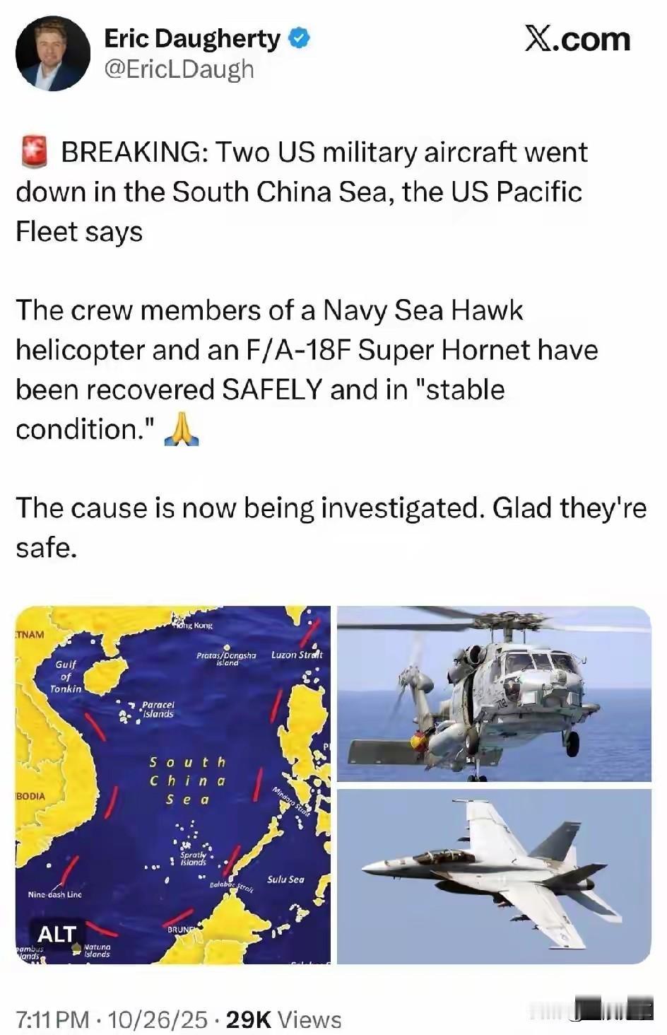 突发:美国太平洋舰队称,两架美军飞机在南海坠毁。 ​一架海军“海鹰”直升机和一架