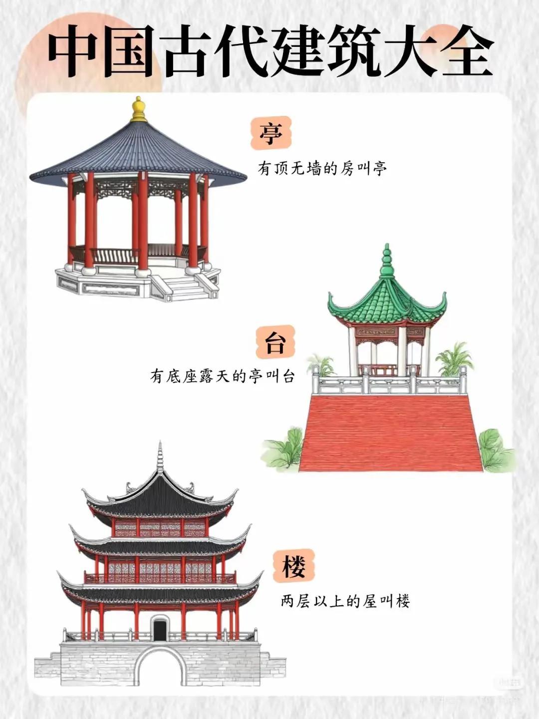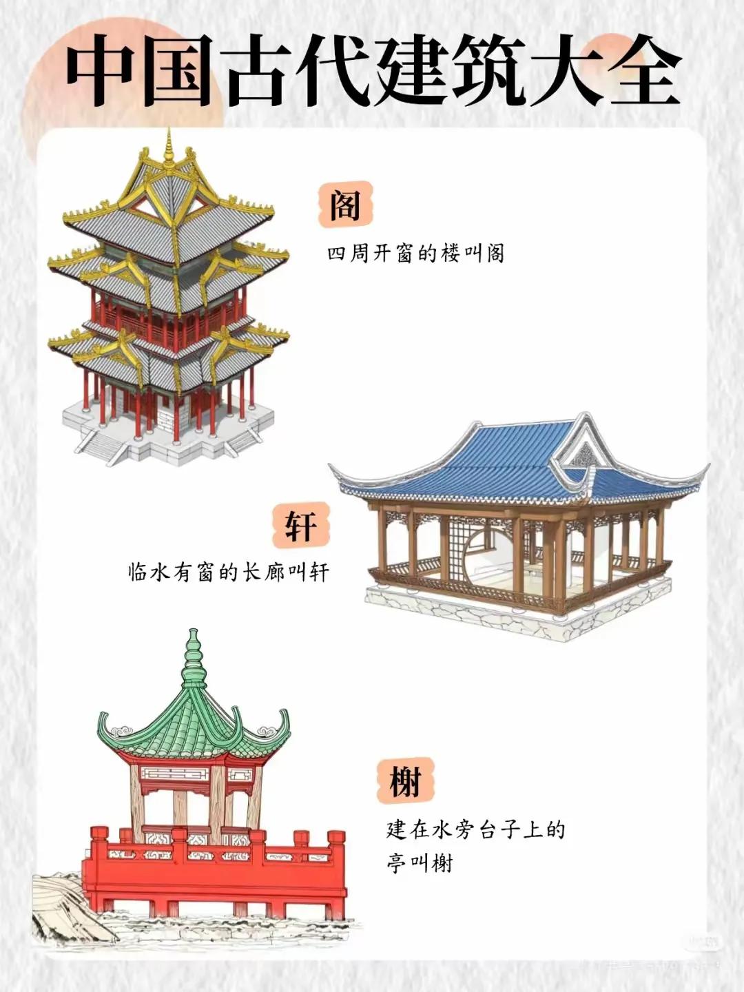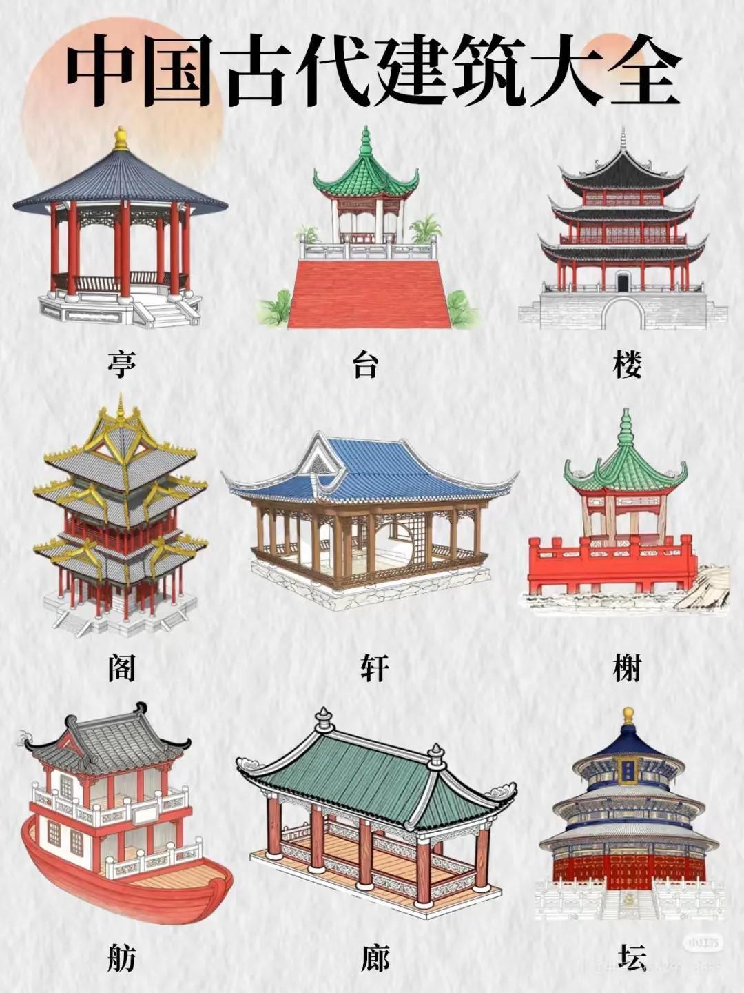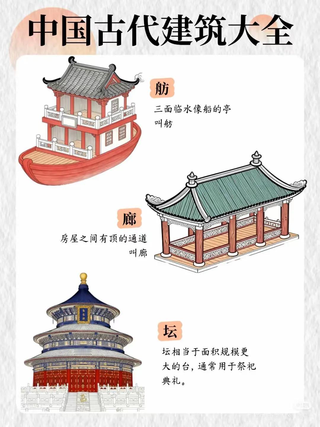 古代建筑与炉的用途与名字 ①有顶无墙的房叫亭 ②有底座露天的亭叫台 ③两层以上的屋叫楼 ④四周开窗的楼叫阁 ⑤房屋之间有顶的通道叫廊 ⑥建在水旁台子上的亭叫榭 ⑦临水有窗的长廊叫轩 ⑧三面临水像船的亭叫舫 ⑨坛相当于面积更大的台,常用于祭祀典礼