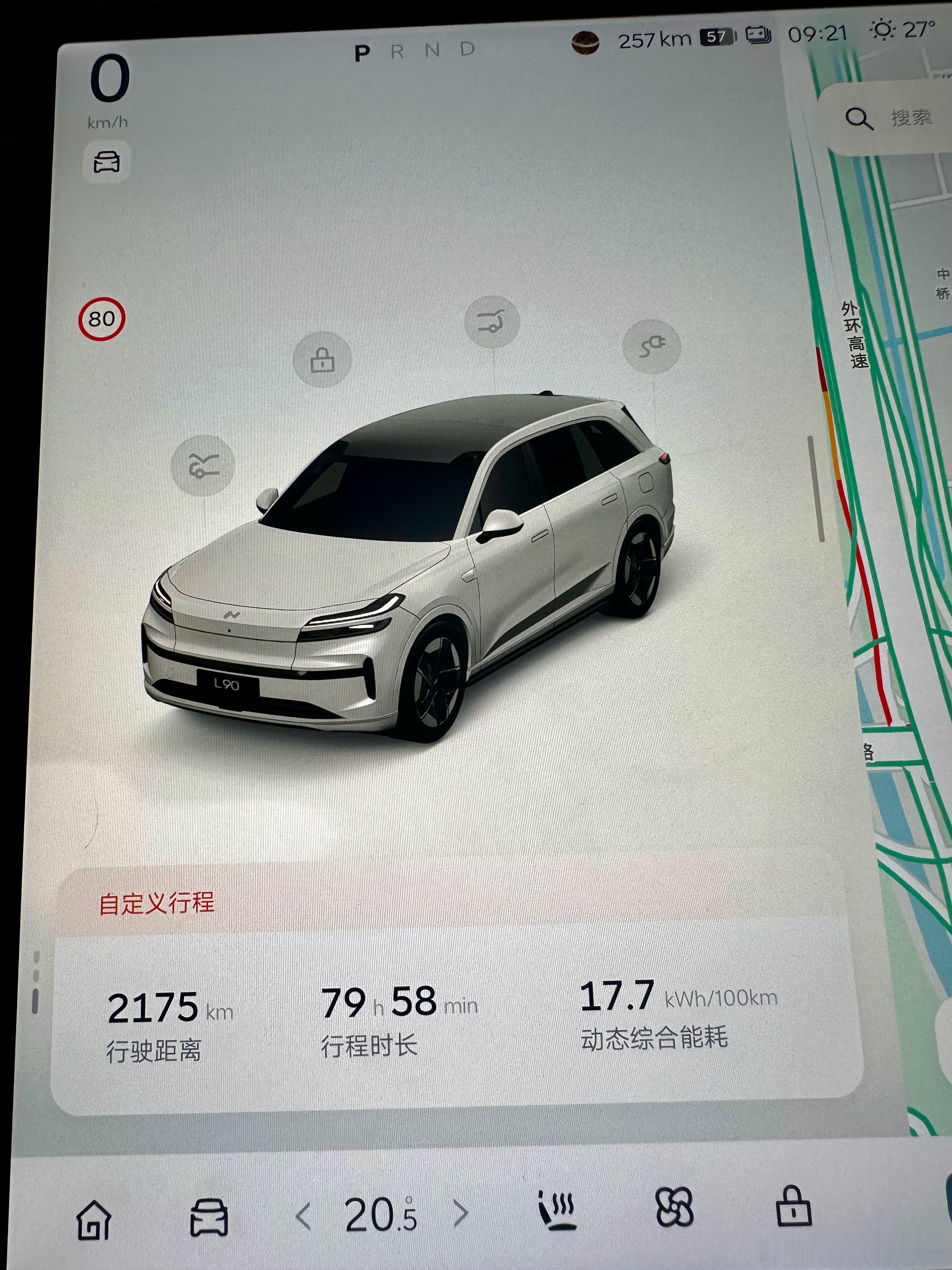 蔚来一直被诟病的能耗问题在L90上得到很好的改善。这次的试驾的是单电机的Max版本。行驶环境基本都是在高速和国道上,平均车速90左右,综合能耗大约在17.7kW/100km。对于一台2.3吨的大型SUV来说,这样的能耗表现已经非常优秀了。