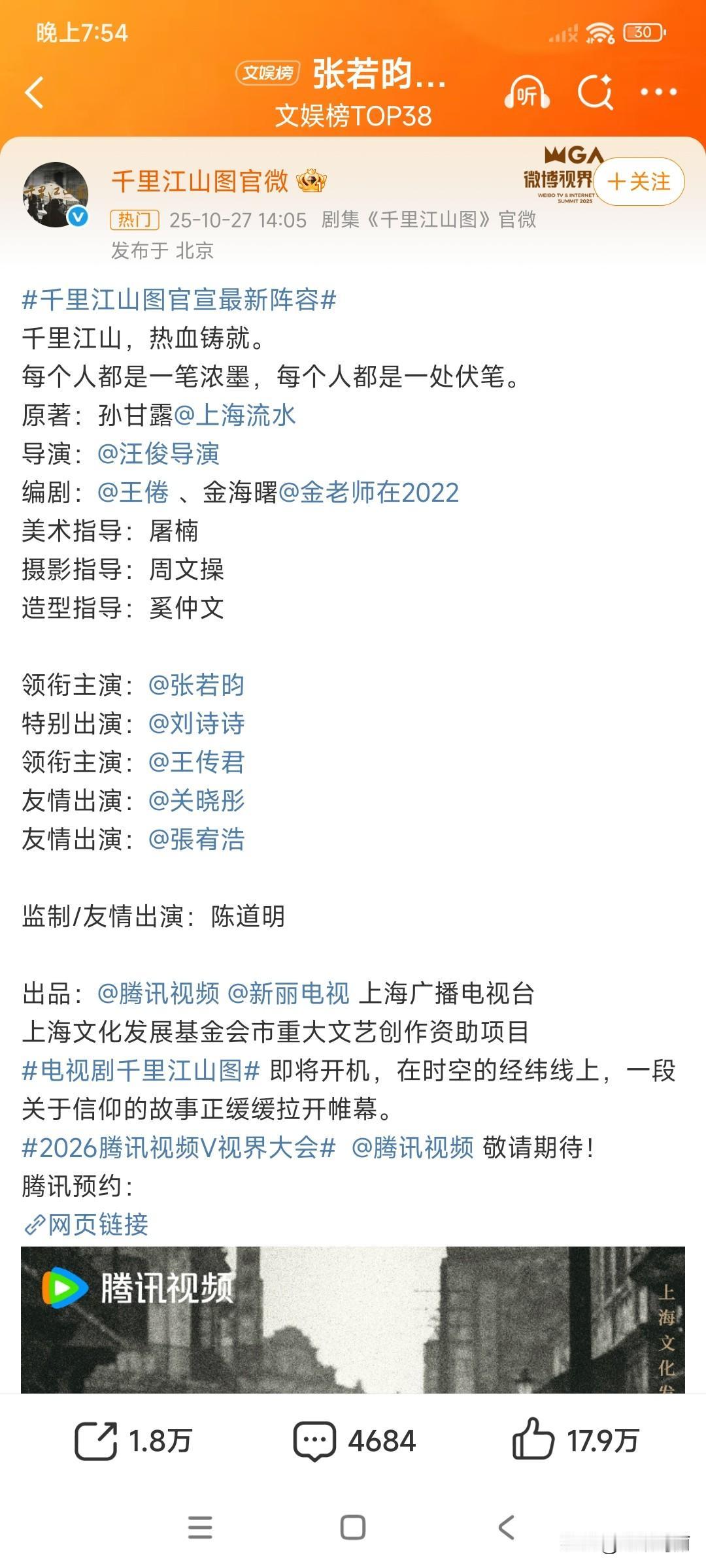 千里江山图腾讯电视剧《千里江山图》官宣阵容:班底阵容都好强!领衔主演:张若昀特别