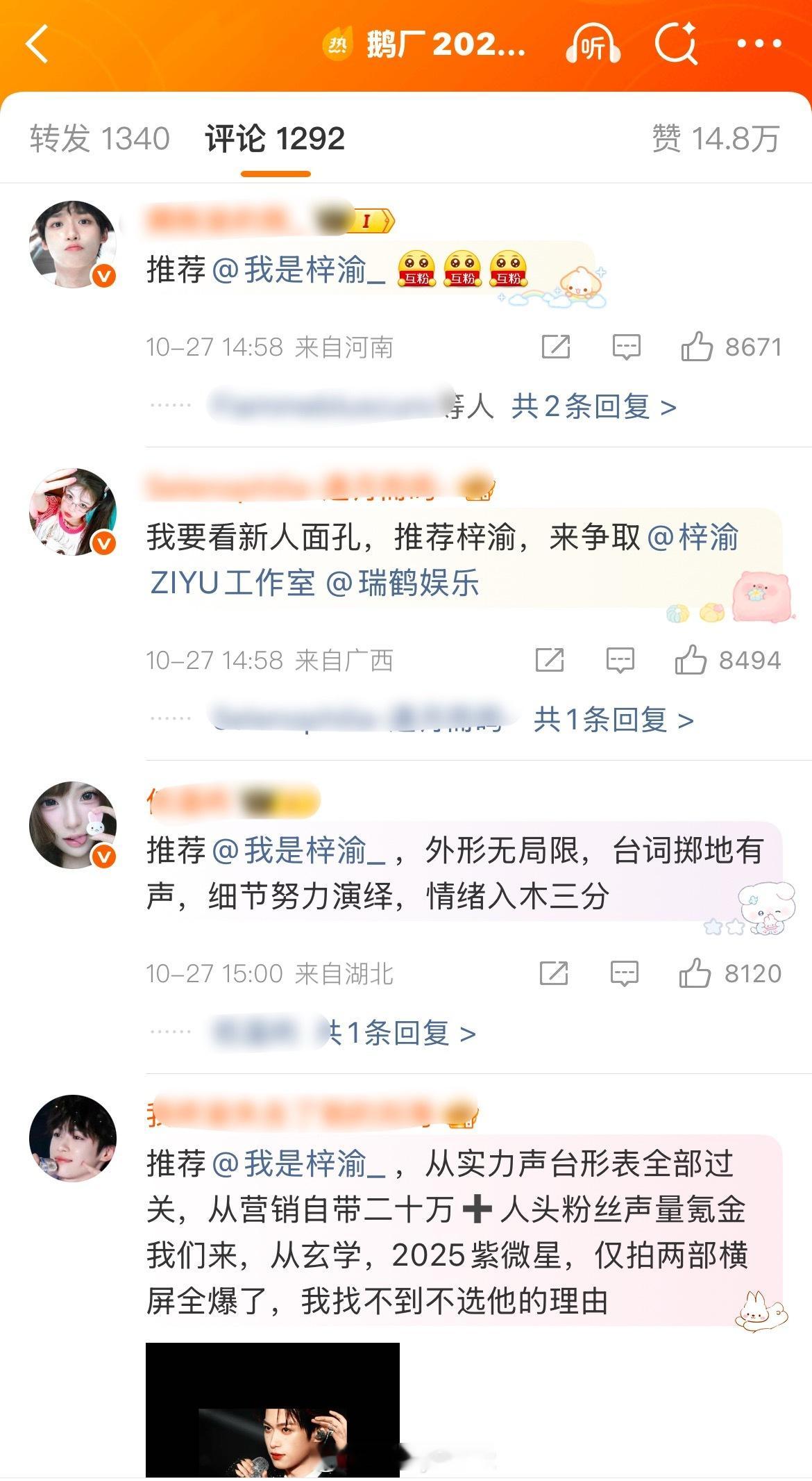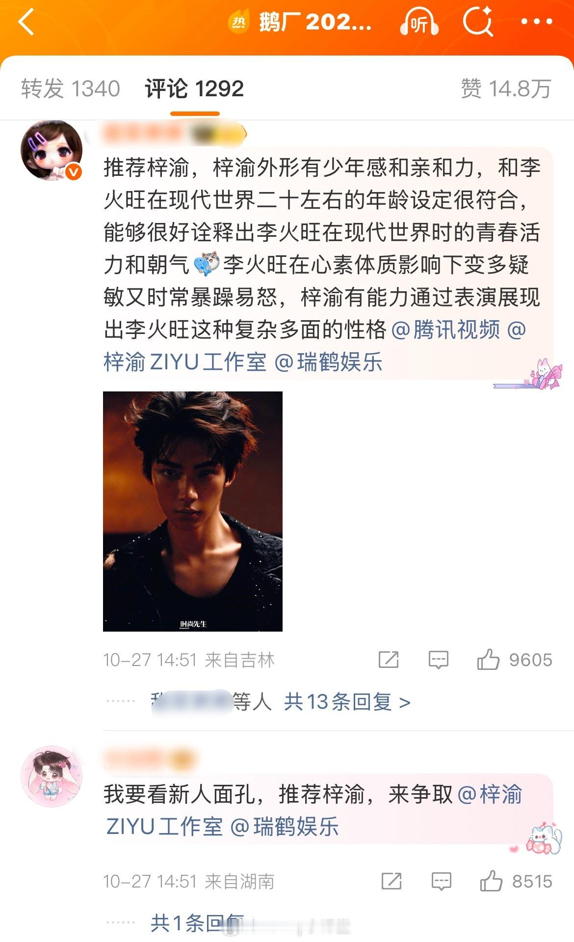 腾讯官宣《道诡异仙》影视化,男主李火旺人气极高,评论区的粉丝都在推荐梓渝,说梓渝完全有能力通过表演展现李火旺复杂多面的性格,而且还是2025紫薇星,找不到不选他的理由。转发区完全是另外一个世界,太有节目了[老师好] ​​​
