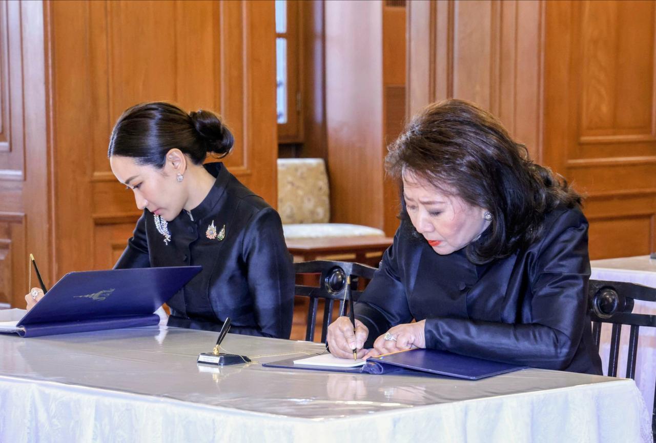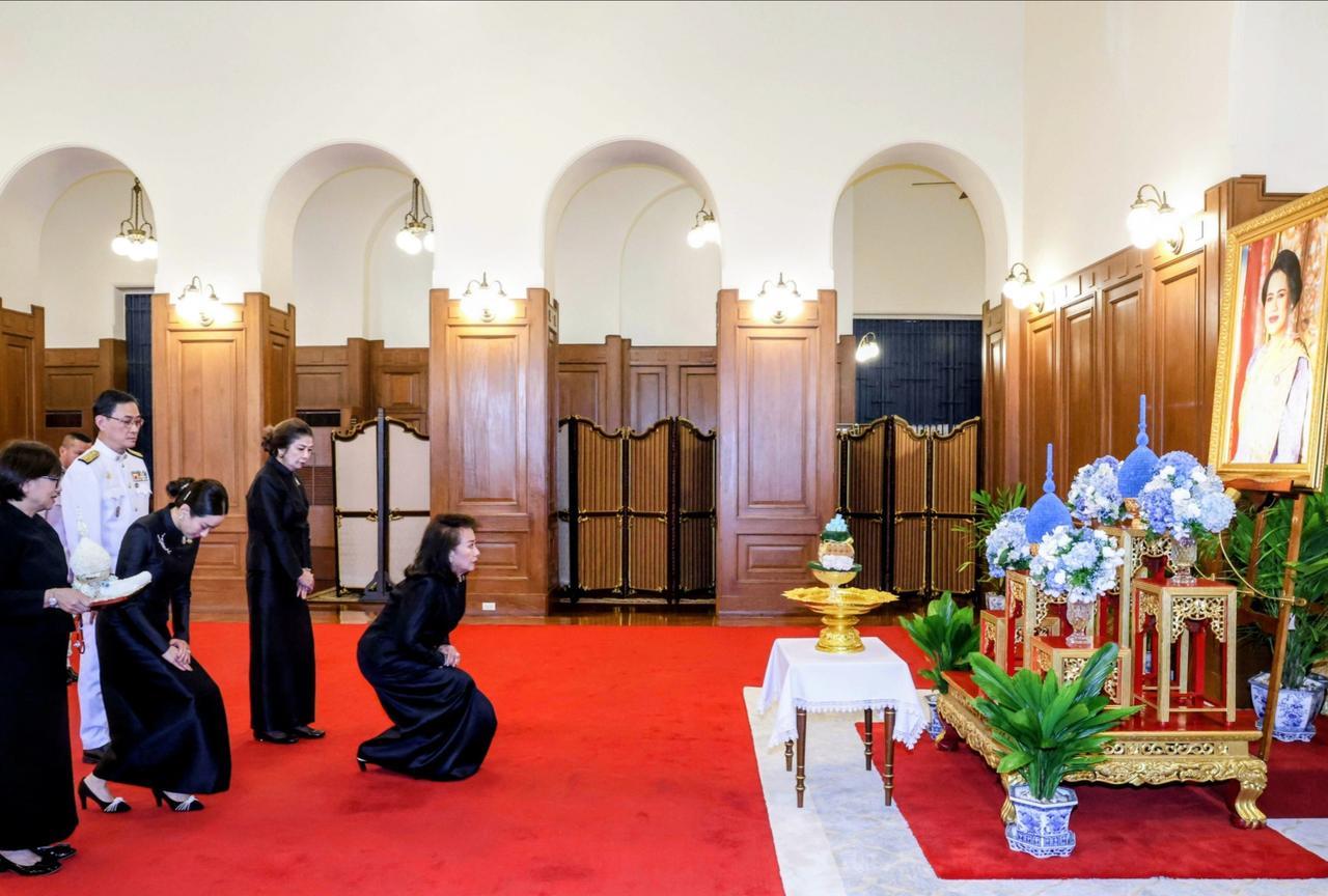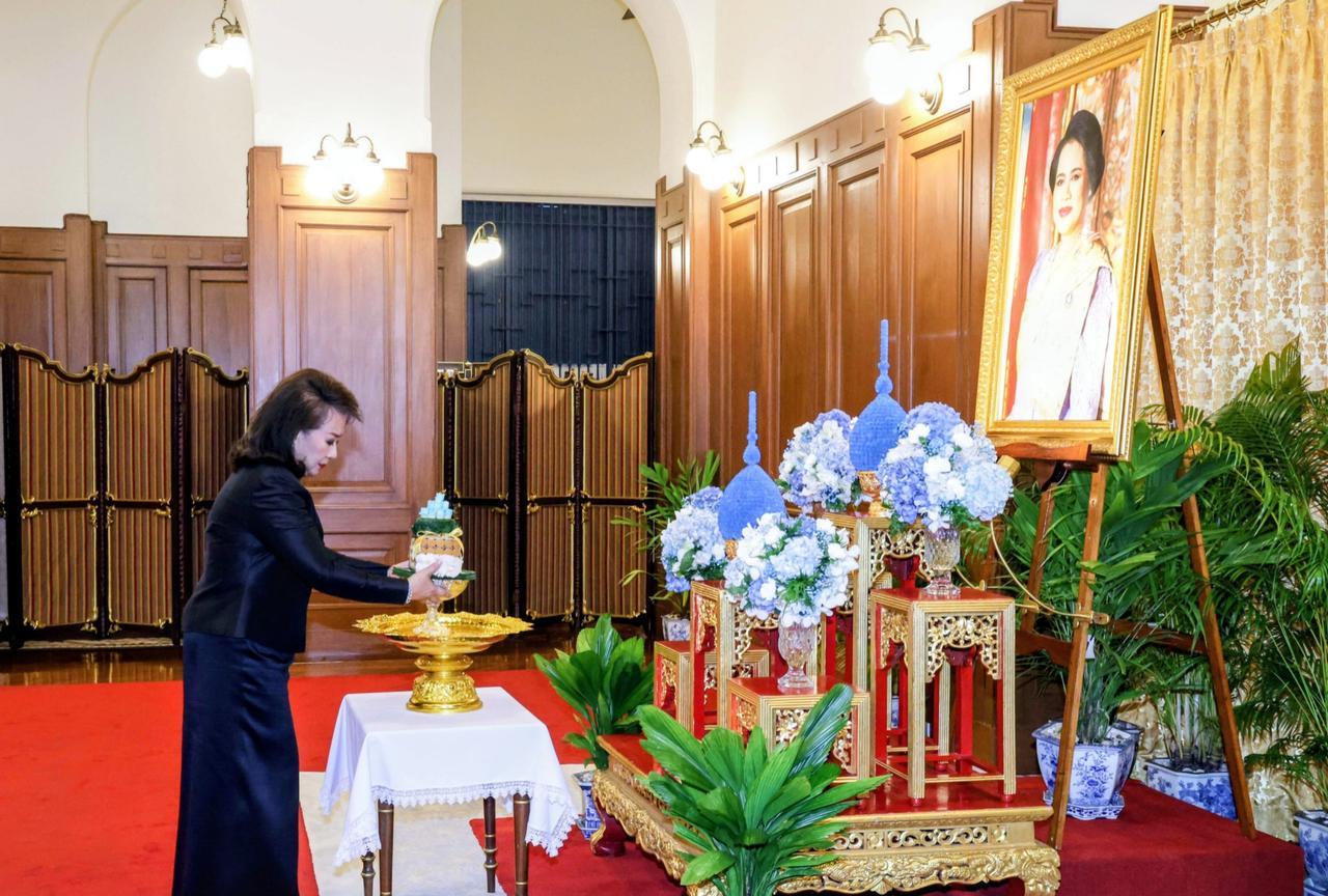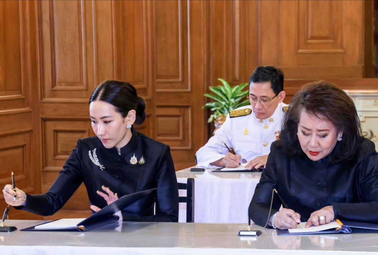 萍通塔带着母亲,一同悼念诗丽吉太后 10月27日,泰国王室事务局首次开放大皇宫内萨哈泰·萨玛空亭后,萍通塔与母亲前来吊唁并签署吊唁簿。母女俩皆身着黑丧服,神情庄重,对着太后照片缓缓行屈膝礼,以表哀思。