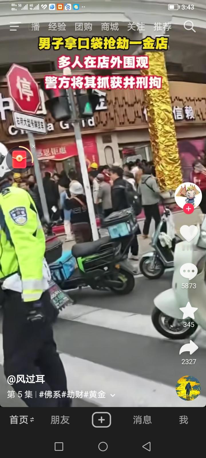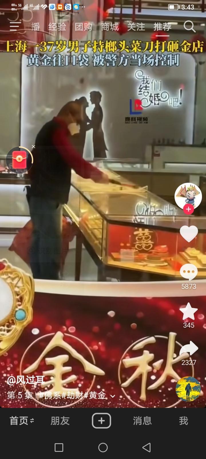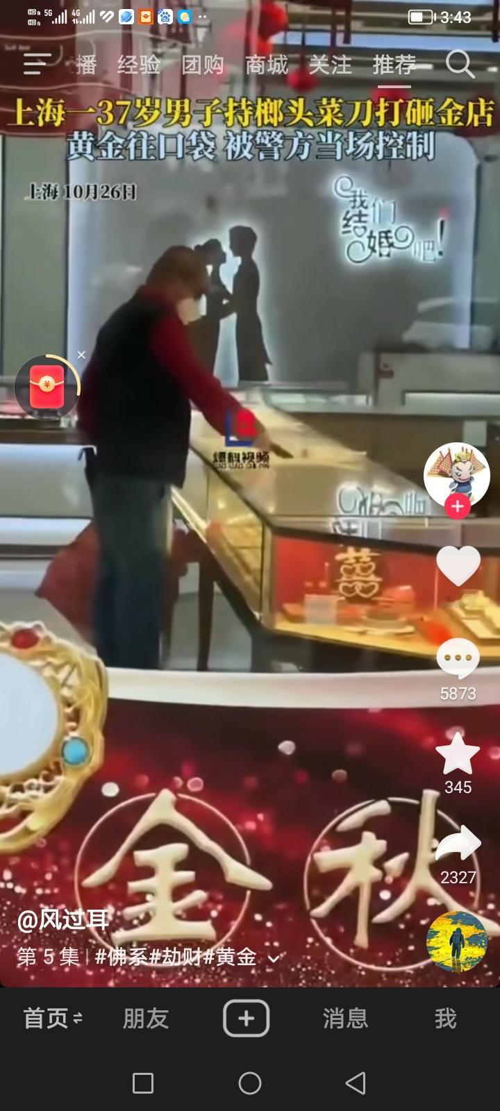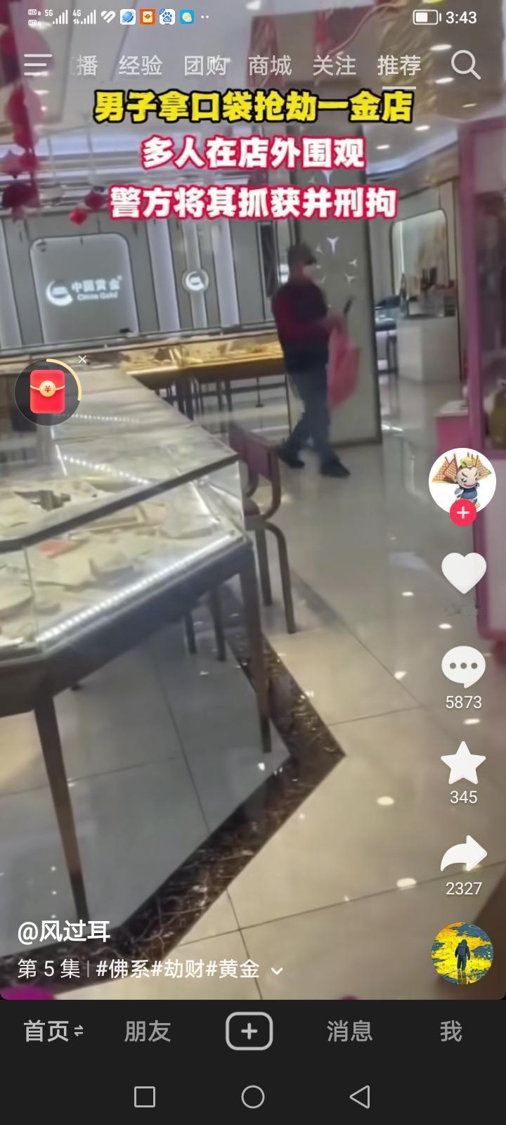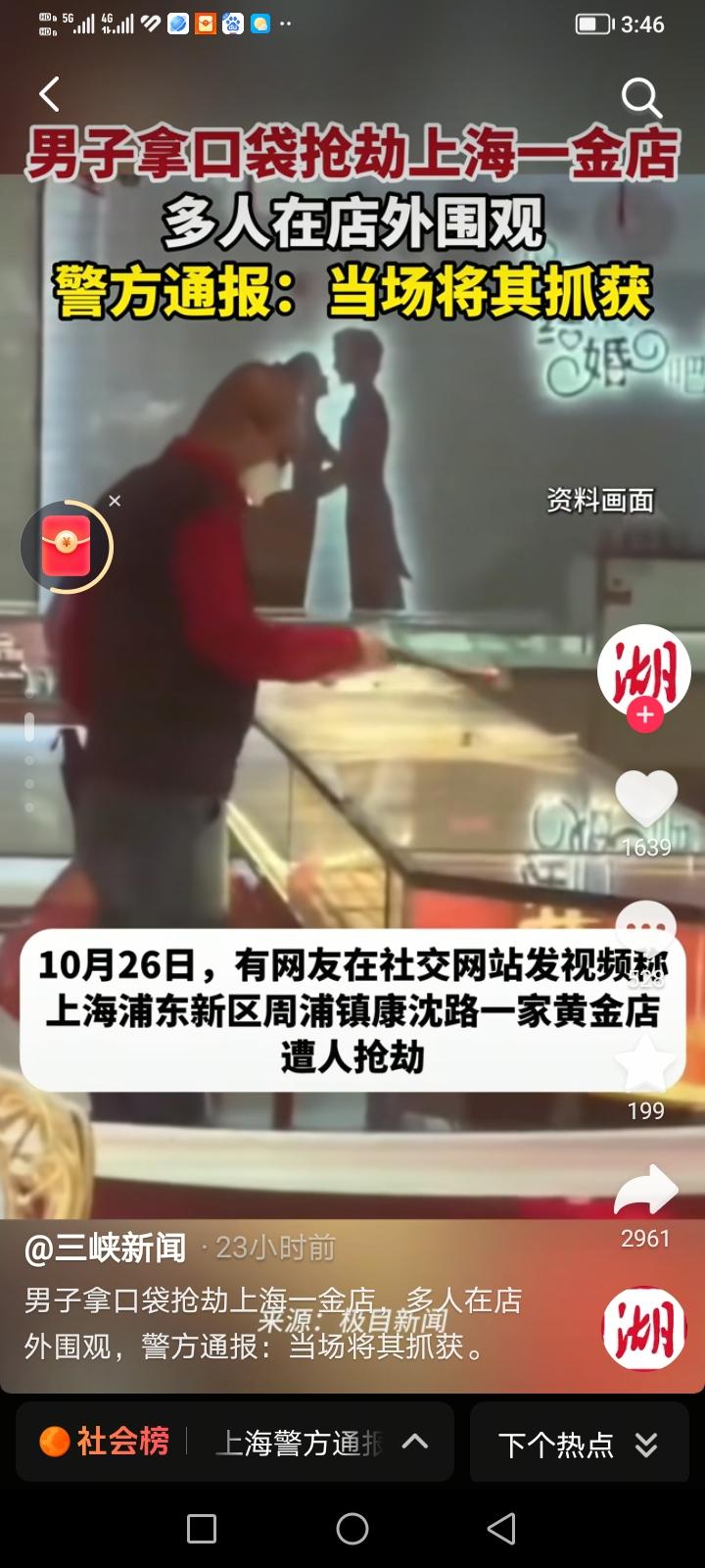 昨天上海金店来了个人,从从容容的抢劫金店,然后从从容容的被叔叔带走。金店外面人们在拿手机拍照,看他拿锤子敲打柜台。整件事没人受伤没有财物损失,可能也就柜台换块玻璃就可以了,这人应该是听说上海局子里伙食不错,想去尝尝咸淡吧。(图片信息来源:@风过耳@三峡新闻)劫金店 黄金首饰店盗窃