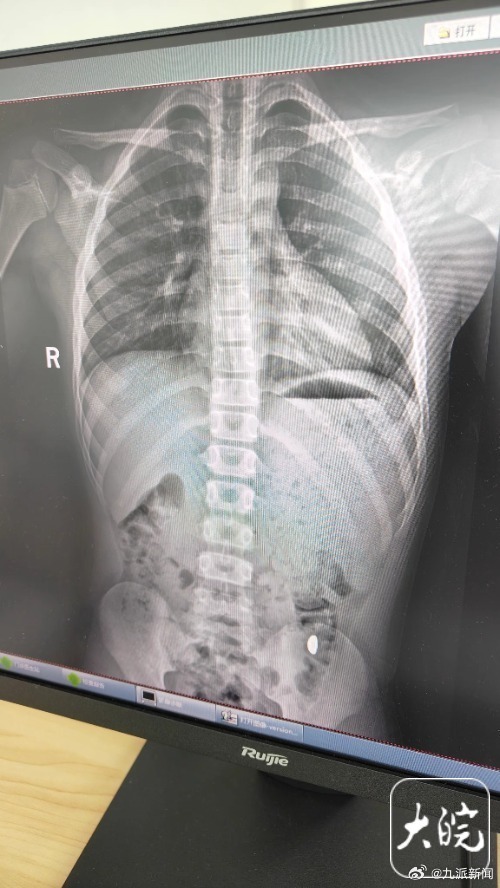 X光片显示金豆已运行到降结肠了,非在胃内。医生说胃内有异物是错误的。