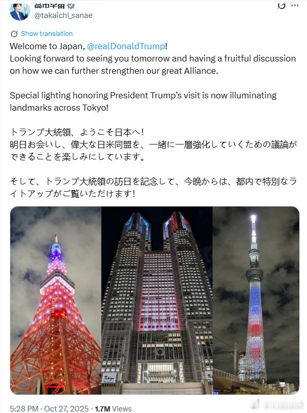 为纪念特朗普总统到访,东京各地的地标建筑今晚都点亮了特别灯光!