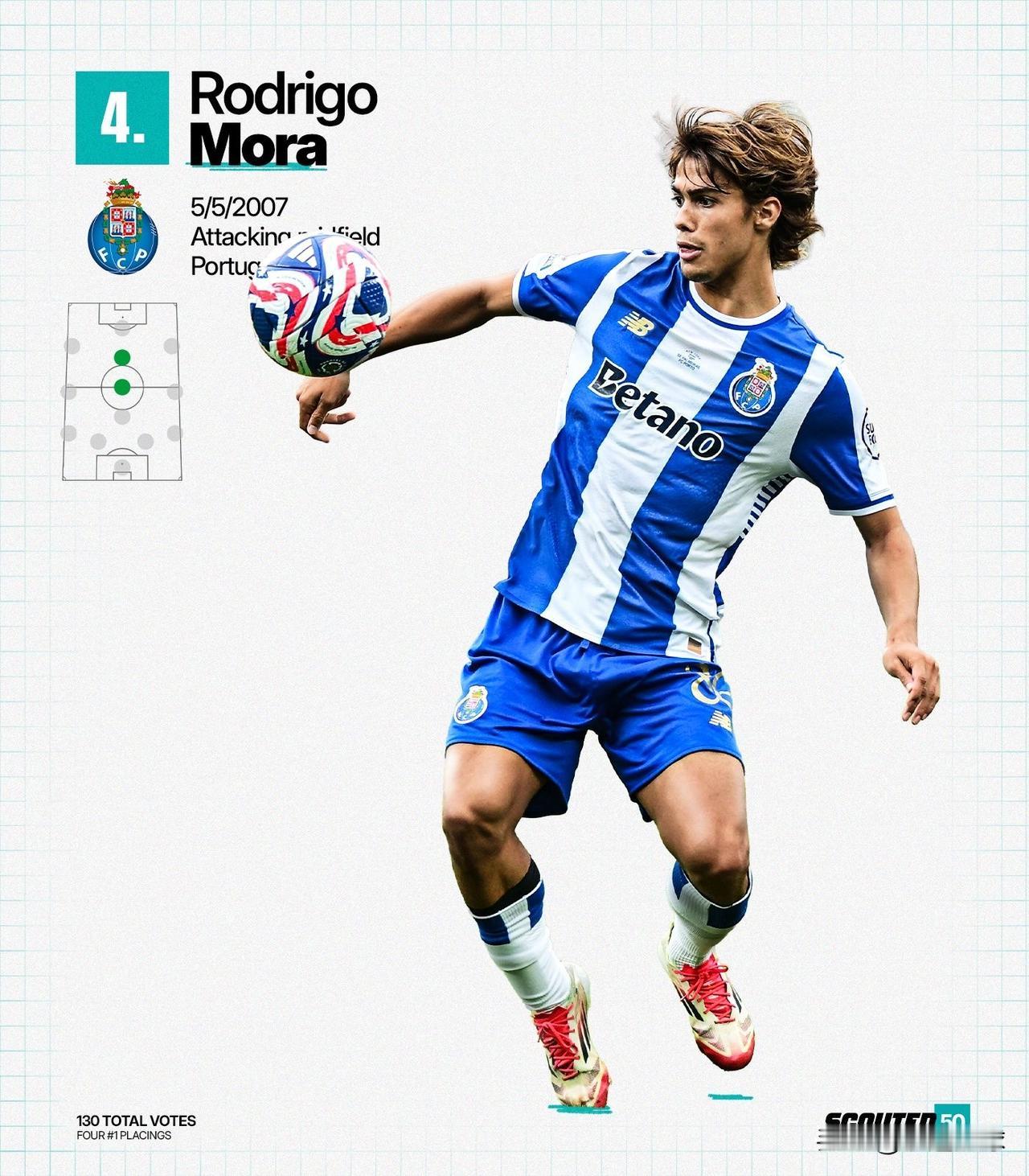 【球星观察:罗德里戈·莫拉】 高效、冷静、沉着——这就是罗德里戈·莫拉的风格。他的技术水准已是精英级别,但比赛内容却充满杀伤力。 他永远向前,带球推进、直插空当、为队友送出直塞,总能找到最优选项——这种“大脑+终结”的混合体,让他同时兼具创造力与得分威胁。 这一切在2034/24赛季欧洲青年联赛以及随后的U-17欧青赛上展露无遗;他被评为该届赛事的“SCOUTED金球奖”得主。 也因此,去年未能入选SCOUTED50,只能说是运气欠佳。 上赛季,他跻身波尔图一线队,并在葡超交出1,387分钟10球4助的成绩单。这份两位数答卷靠的是极致效率,几乎不可复制。莫拉总能在关键时刻完成最后一击,他对最危险得分区域的嗅觉,是他顶级球商的明证。 今夏一度接近转会沙特,最终流产,也打乱了他的季前备战。但如今,他有机会重新夺回主力位置,并向2026年世界杯大名单发起冲击。
