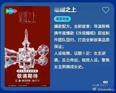 临时立项的新剧,直接过会腾讯S+,问题是光靠《许我耀眼原班制作团队》几个字就空降鹅厂现代剧大剧片单,排序第二,第一是新丽的大剧
