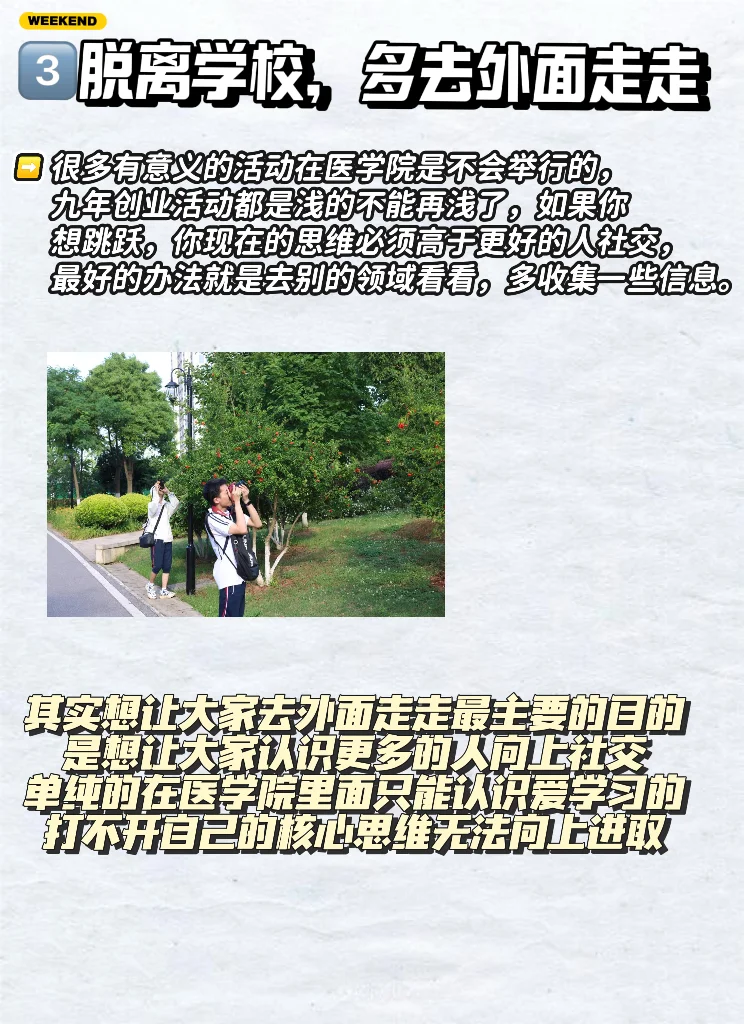 很多有意义的活动在医学院是不会举行的,九年创业活动都是浅的不能再浅了,如果你想跳跃,你现在的思维必须高于更好的人社交,最好的办法就是去别的领域看看,多收集一些信息。