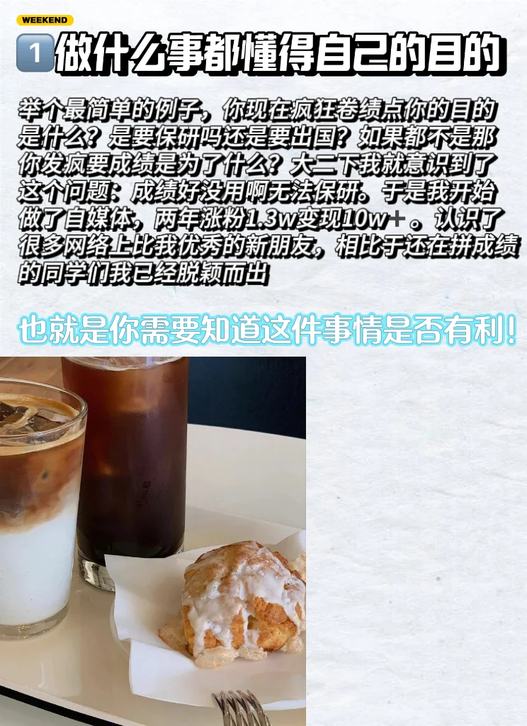 举个最简单的例子,你现在疯狂卷绩点你的目的是什么?是要保研吗还是要出国?如果都不是那你发疯要成绩是为了什么?大二下我就意识到了这个问题:成绩好没用啊无法保研。于是我开始做了自媒体,两年涨粉1.3w变现10w➕。认识了很多网络上比我优秀的新朋友,相比于还在拼成绩的同学们我已经脱颖而出