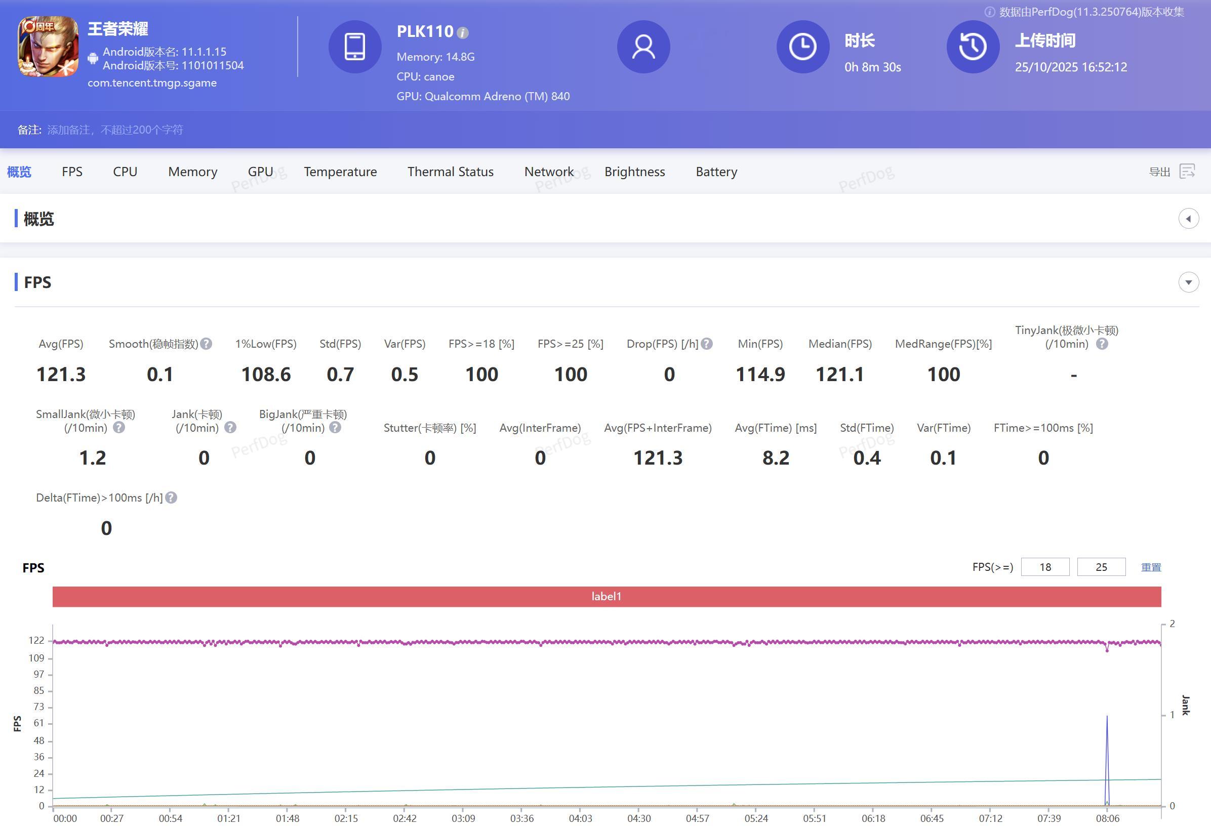 一加15真香针对一加15的游戏性能表现也专门进行了测试,使用Perfdog软件对游戏帧率进行了记录。首先是王者荣耀,在全高极致画质模式下,单局平均帧率达到了121.3帧,我打游戏习惯打开4D振感模式,释放技能和击杀英雄时震动的手感反馈真的超爽。