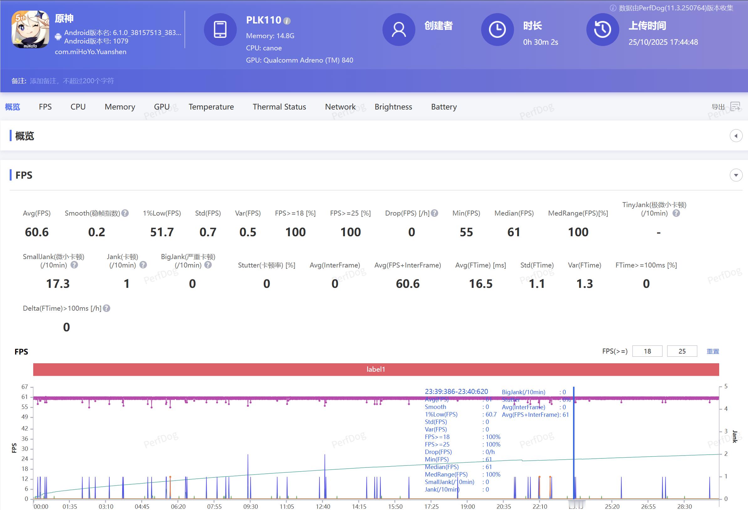 然后又进行了30分钟的原神测试,同样开启60帧高帧率模式,平均帧率达到了60.6帧,依然稳如一条直线,同样开启4D振感,释放技能效果也更好。整场游戏下来机身也仅仅是有点温热而已。