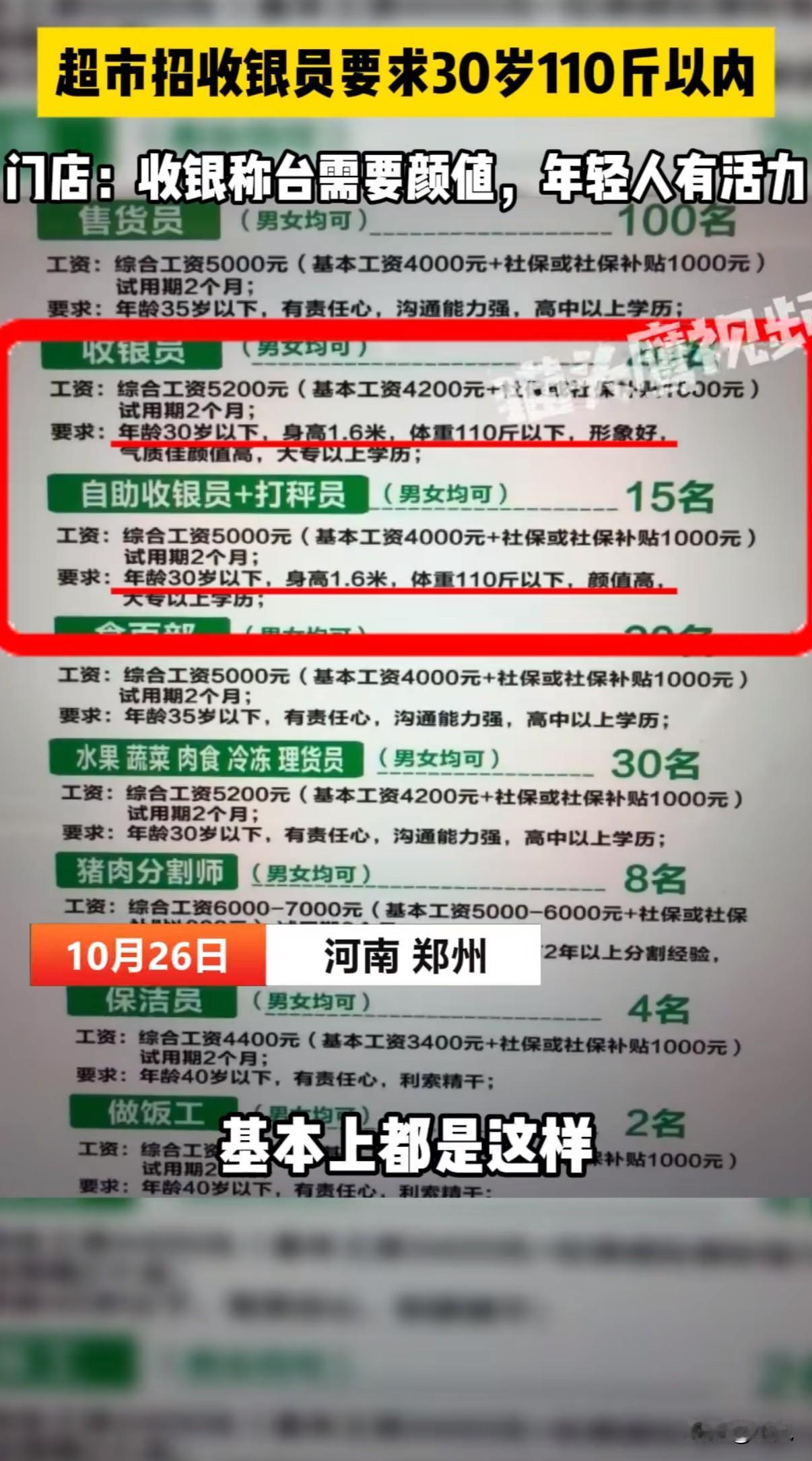 “收银员也要看脸?”!郑州一家超市,收银员岗位明确要求:30岁以下,身高1米6,