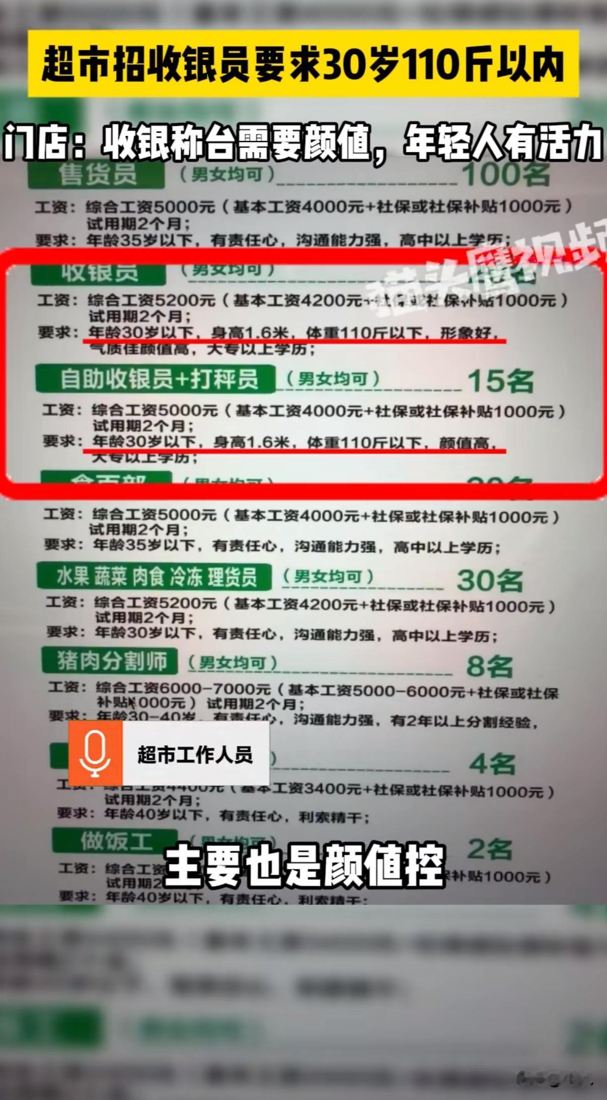 “收银员也要看脸?”!郑州一家超市,收银员岗位明确要求:30岁以下,身高1米6,体重110斤以下,还要“形象好、气质佳、颜值高”。 这标准让不少网友直呼:现在当收银员都要参加选美了? 超市工作人员回应,这是公司统一标准,30岁以上的求职者暂不考虑。这个回应让争议进一步升级。 类似情况在服务行业并不少见。长沙一家饭店曾推出“颜值补贴”,门迎和收银岗位,长相好看的员工每月多拿500元,身高高的还能额外加钱。虽然招聘后来撤下,但这种现象值得思考。 更让人惊讶的是胖东来的招聘情况。一个超市营业员岗位,5分钟内收到8.3万份简历。保洁、保安要求本科学历,25岁以下。就连药学专业硕士生应聘医药收银员都没成功。 收银员的核心工作是结账、理货、服务顾客,需要的是细心、耐心和计算能力。这些要求与身高体重并无直接关联。 新乡市人社局已介入调查胖东来招聘事宜,认为保安岗位仅限男性可能涉及性别歧视。法律专家指出,虽然现行法律未明确禁止身高和年龄歧视,但这些条件确实影响到就业公平。 当前就业市场竞争激烈,普通岗位应聘者众多。企业注重形象可以理解,但更应关注员工的实际工作能力和服务意识。外表条件不应成为阻碍优秀人才就业的门槛。 服务行业的核心竞争力在于服务质量,而非员工的外在条件。过度强调颜值,可能偏离了服务业的本意。